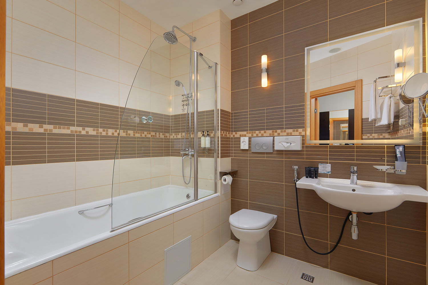 Санузел: с душем или ванной, тапочки, туалетные принадлежности, фен, халат