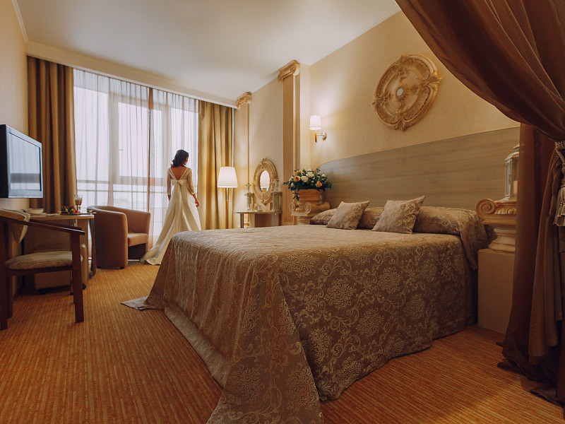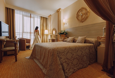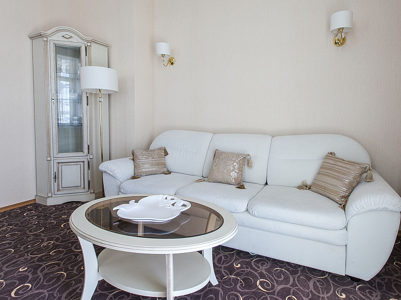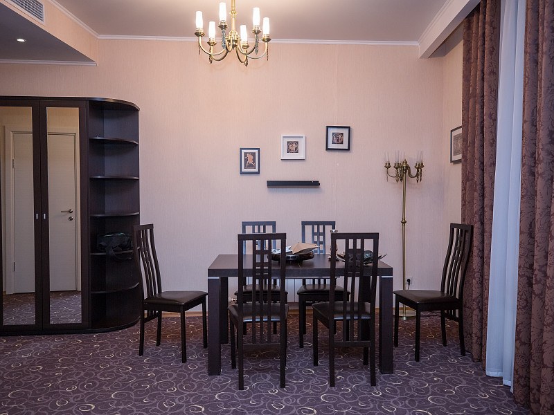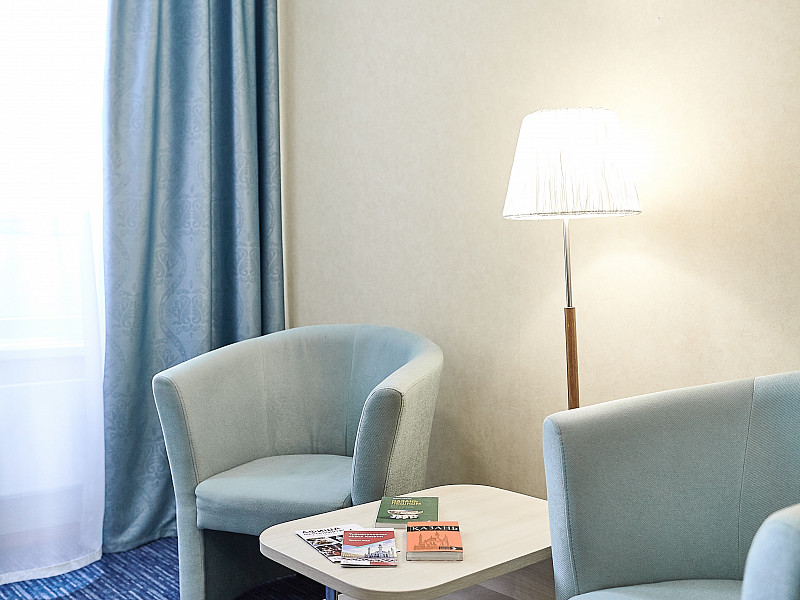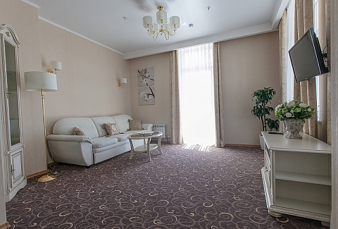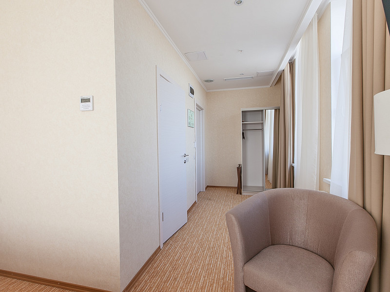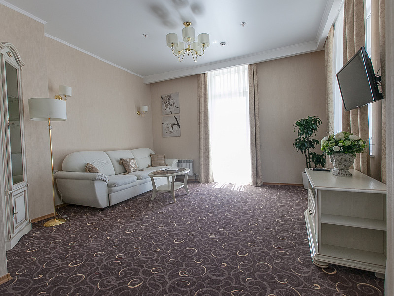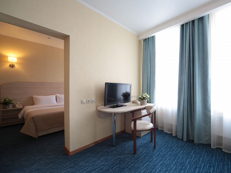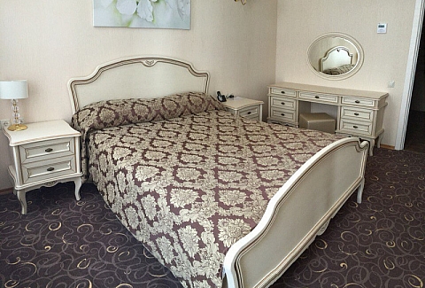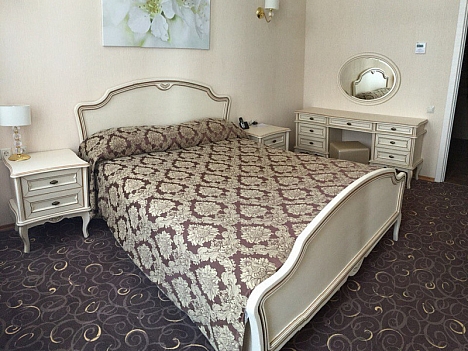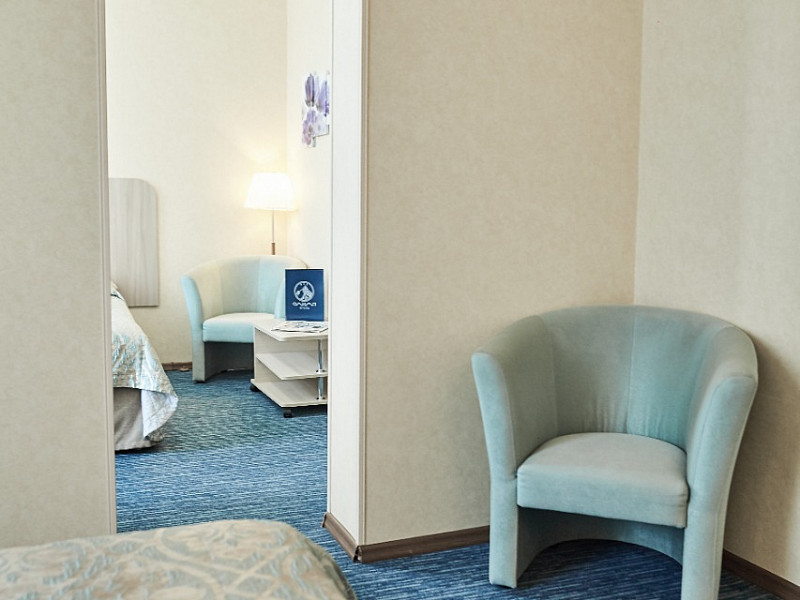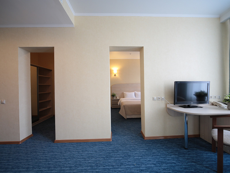 В номере: диван раскладной, кровать двуспальная, прикроватные тумбочки, стол, стулья, шкаф, кондиционер, мини-холодильник, сейф, телевизор ЖК, телефон, чайный набор посуды, электрочайник