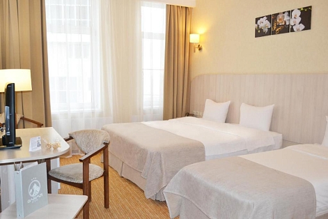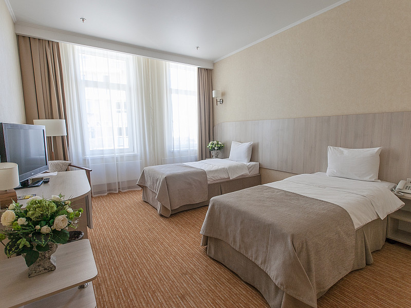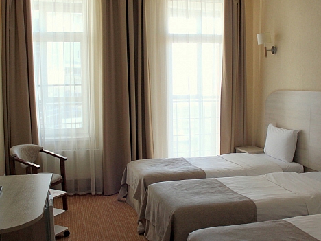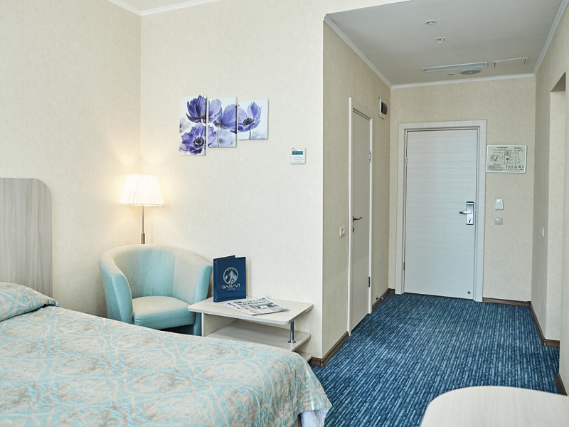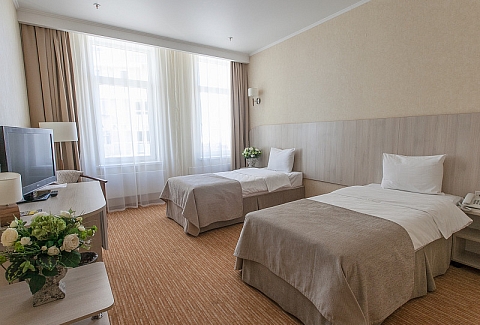 В номере: вешалка, зеркало, кровати односпальные, прикроватные тумбочки, стол, стул, шкаф, кондиционер, мини-холодильник, телевизор ЖК, телефон, чайный набор посуды, электрочайник
