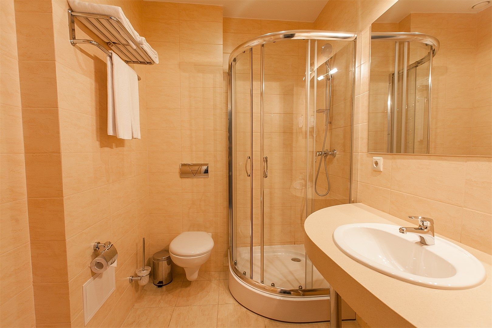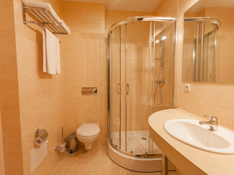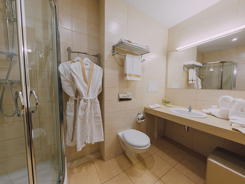 Санузел: с душевой кабиной, тапочки, туалетные принадлежности, фен, халат