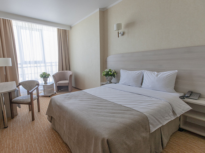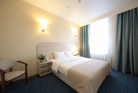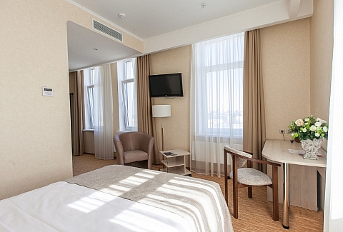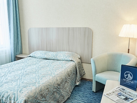 В номере: вешалка, зеркало, кровать двуспальная, прикроватные тумбочки, стол, стул, шкаф, кондиционер, мини-холодильник, телевизор ЖК, телефон, чайный набор посуды, электрочайник