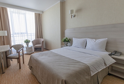 В номере: вешалка, зеркало, кровать двуспальная, прикроватные тумбочки, стол, стул, шкаф, кондиционер, мини-холодильник, сейф, телевизор ЖК, телефон, чайный набор посуды, электрочайник
