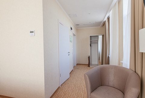 В номере: вешалка, зеркало, кровать двуспальная, кровать односпальная, прикроватные тумбочки, стол, стул, шкаф, кондиционер, мини-холодильник, телевизор ЖК, телефон, чайный набор посуды, электрочайник