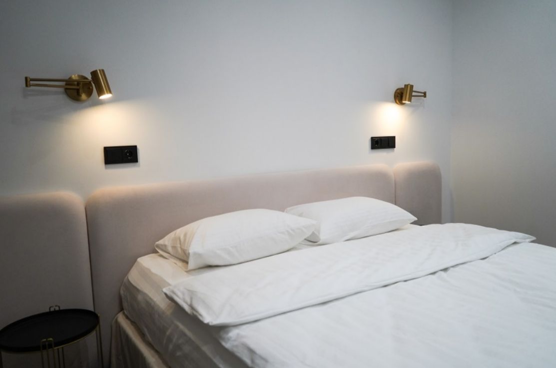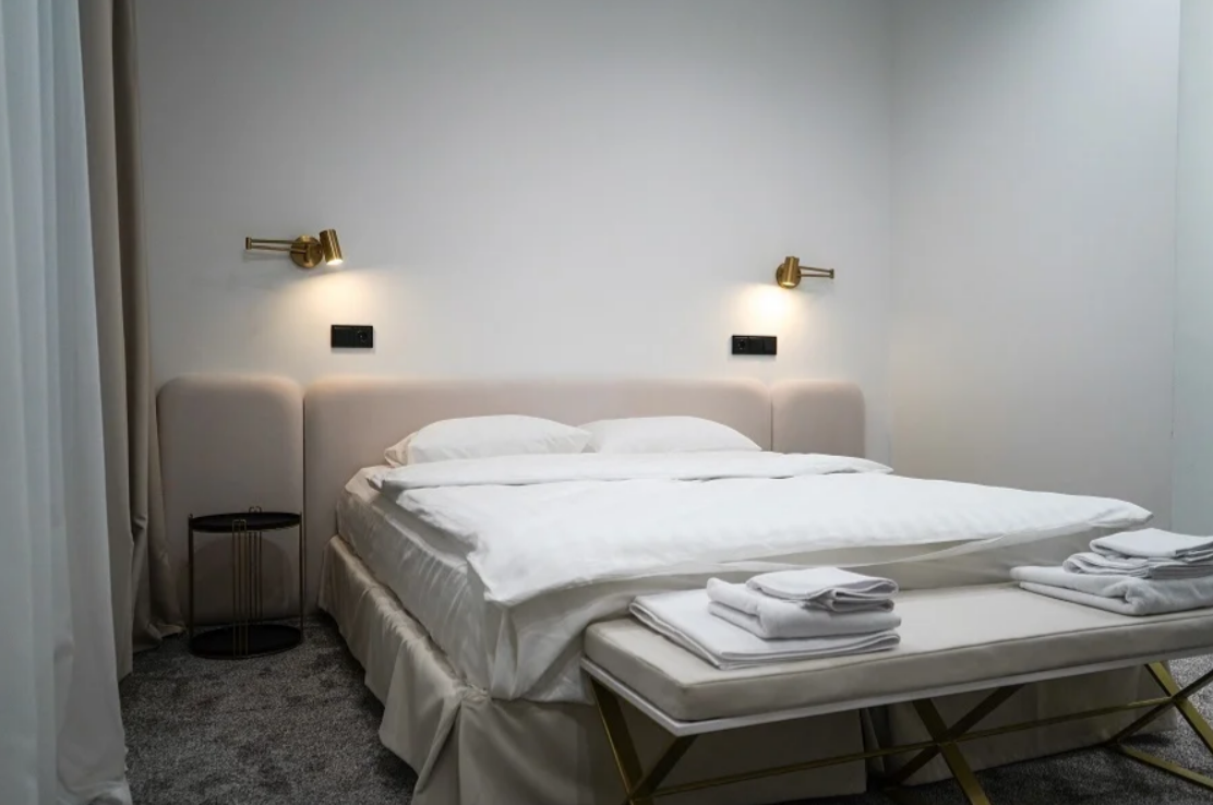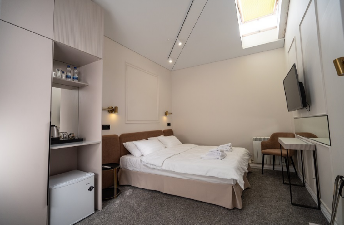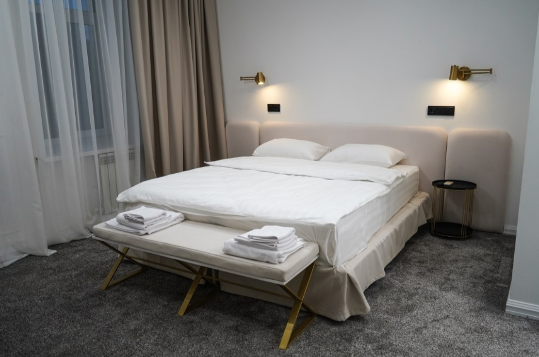 В номере: вешалка, зеркало, кровать двуспальная, прикроватные тумбочки, стол, стул, шкаф, гладильная доска, кондиционер, мини-холодильник, сейф, телевизор, утюг, электрочайник