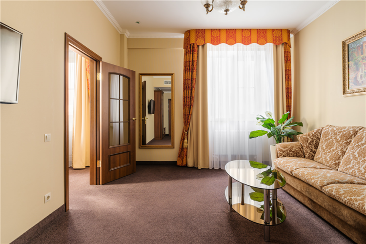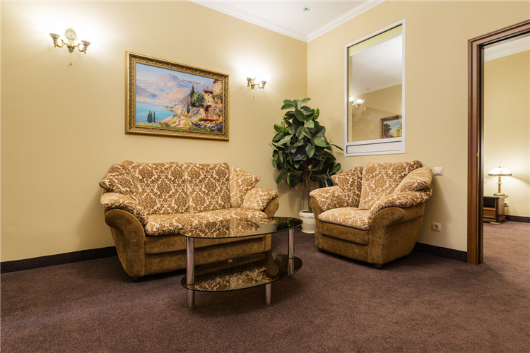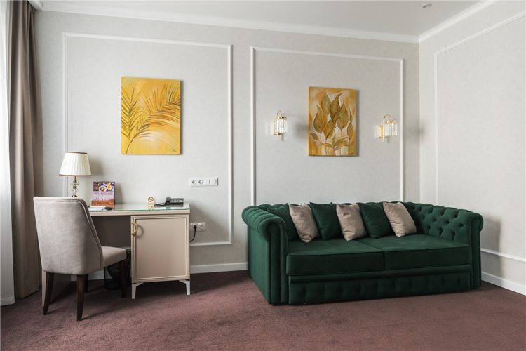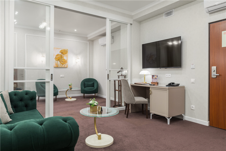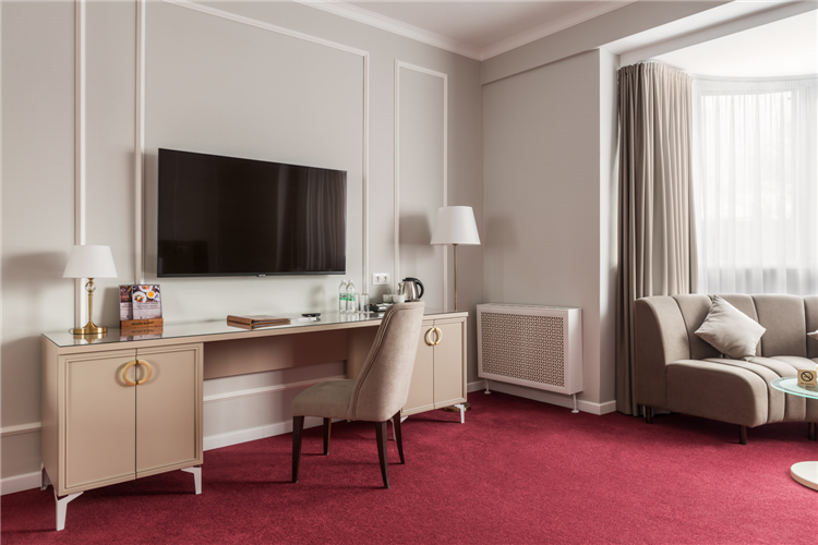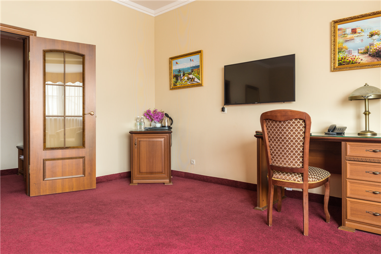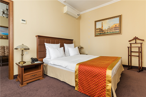 В номере: вешалка, диван, зеркало, кровать двуспальная, прикроватные тумбочки, стол, стулья, шкаф, кондиционер, сейф, телевизор, чайная станция