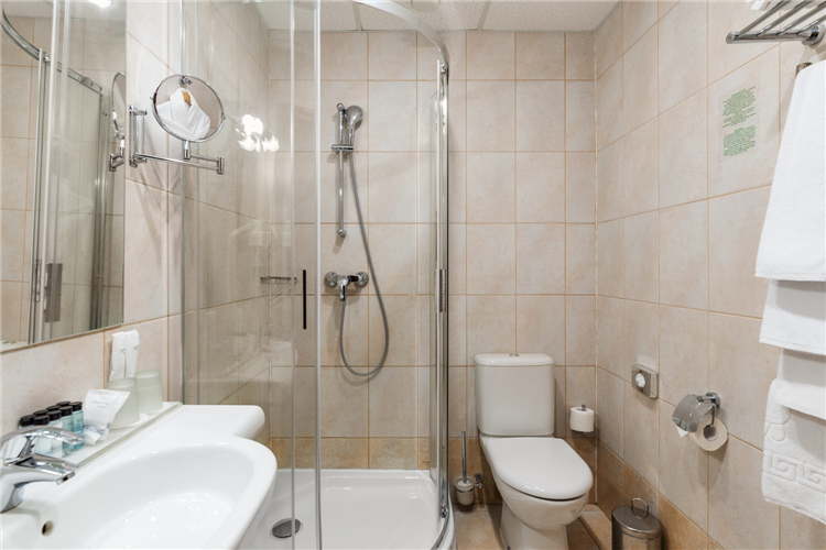 Санузел: с душевой кабиной, тапочки, туалетные принадлежности, фен
