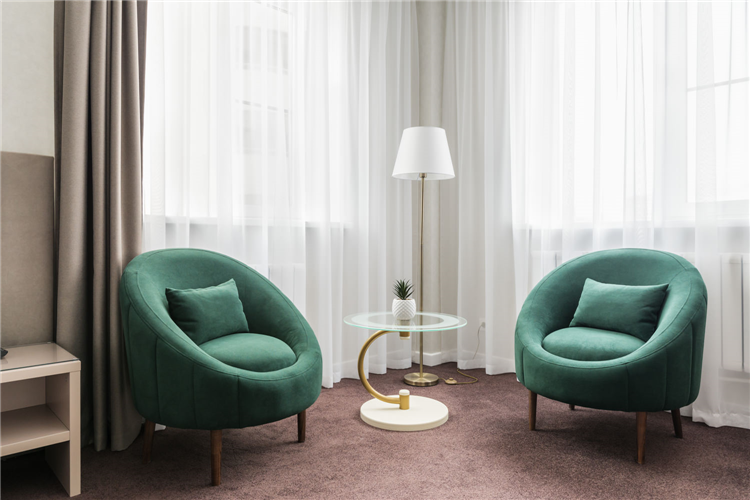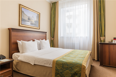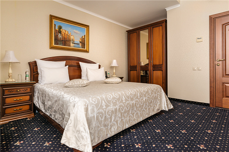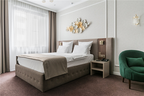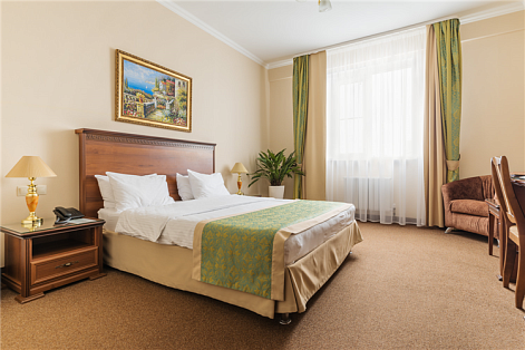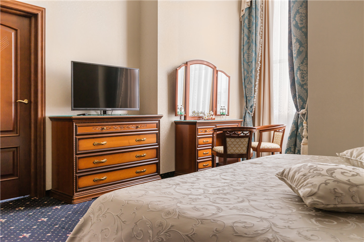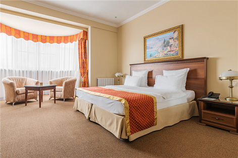 В номере: вешалка, зеркало, кресло, кровать двуспальная, прикроватные тумбочки, столик журнальный, стул, шкаф, сейф, система общего кондиционирования, телевизор ЖК, телефон, чайный набор посуды
