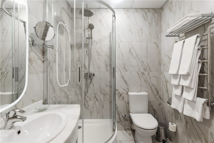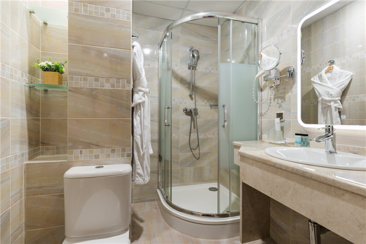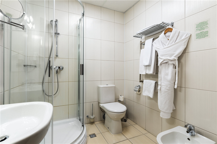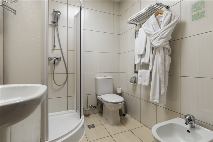 Санузел: с душевой кабиной, тапочки, туалетные принадлежности, фен, халат