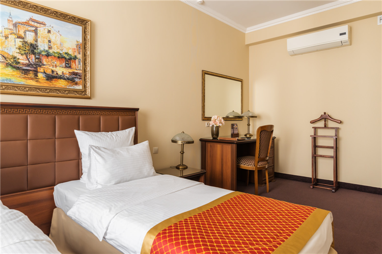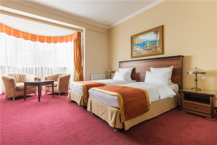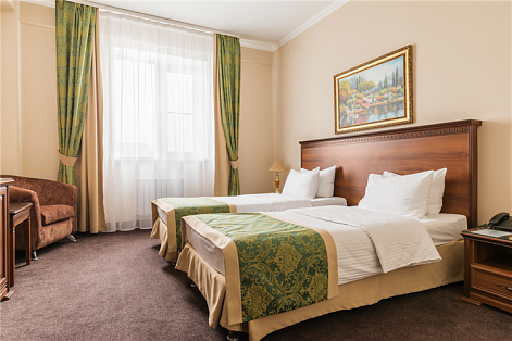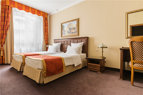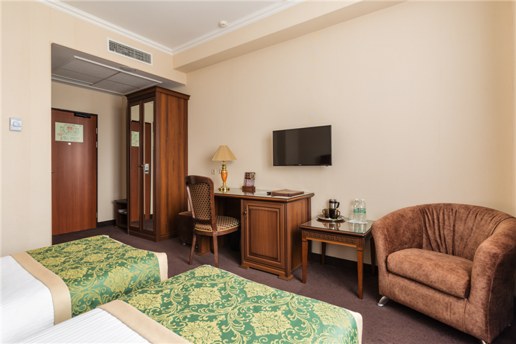В номере: вешалка, зеркало, кресло, кровати односпальные, прикроватные тумбочки, столик журнальный, стул, шкаф, сейф, система общего кондиционирования, телевизор ЖК, электрочайник