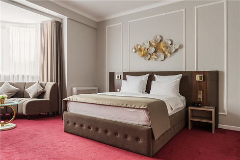 9-ти этажное здание отеля, оснащенное лифтами, включает в себя комфортабельные светлые номера категории Стандарт, Джуниор Сьют, Джуниор Сьют Улучшенный, 2-х комнатный Люкс, Люкс Улучшенный и вместительные Апартаменты с кухней и джакузи, рассчитанные на единовременное размещение 150 человек. В распоряжении постояльцев тренажерный зал, крытый 15-ти метровый бассейн, сауна и хаммам. Для проведения деловых мероприятий в отеле предусмотрены большой и малый конференц залы, вместимостью 120 и 40 человек соответственно. Всем постояльцам доступны услуги бытовых служб, беспроводной интернет, возле корпуса организована автостоянка.
