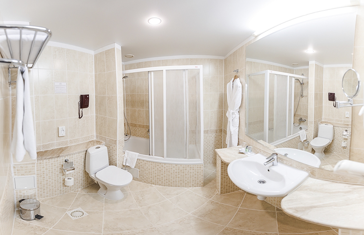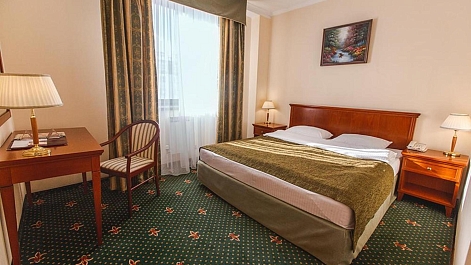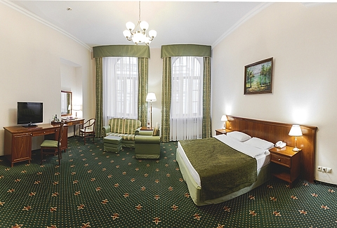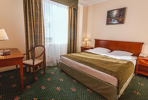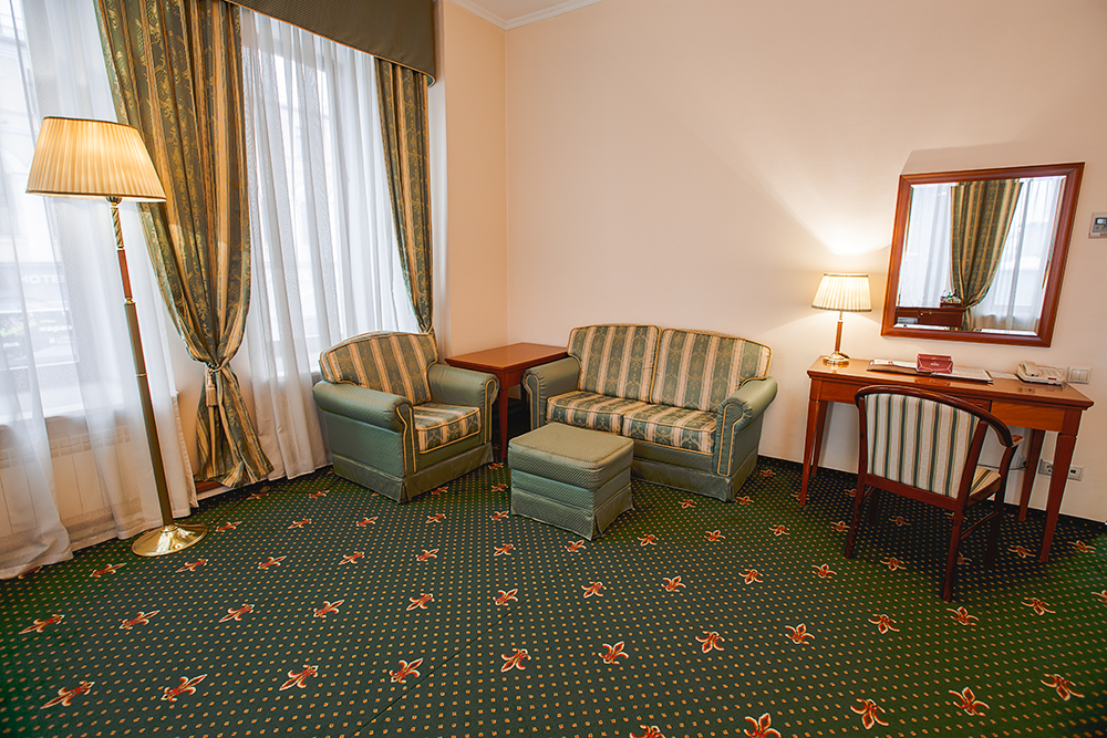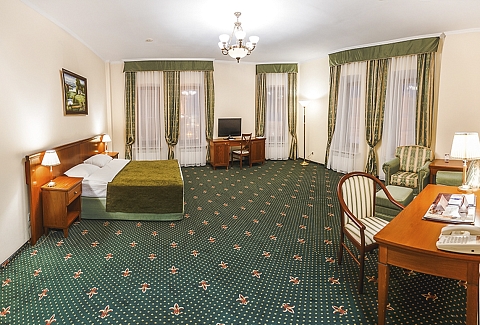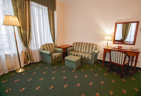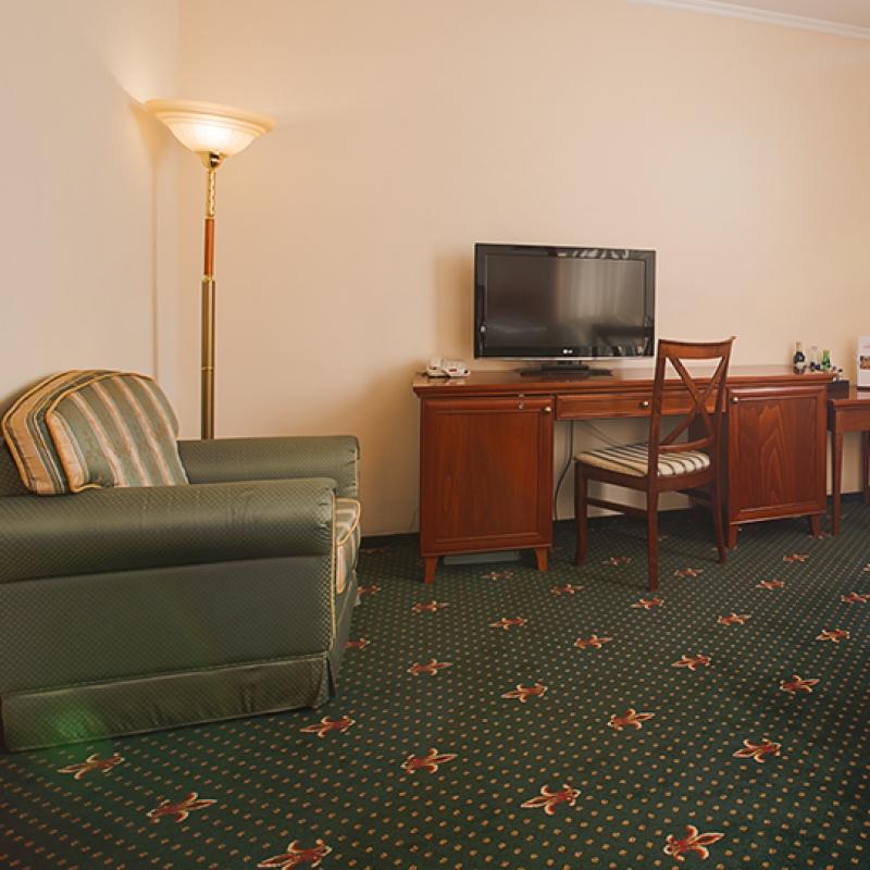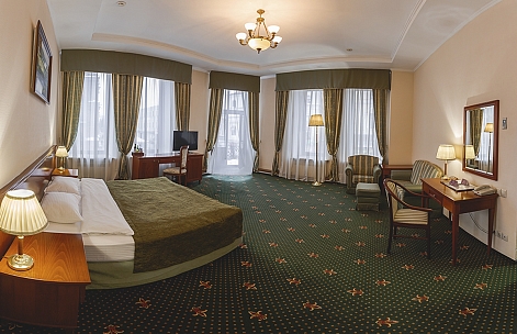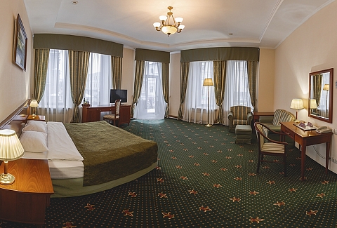 В номере: вешалка, зеркало, кровать двуспальная, мягкий уголок, прикроватные тумбочки, стол, стулья, шкаф, кондиционер, сейф, телевизор, телефон