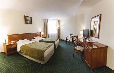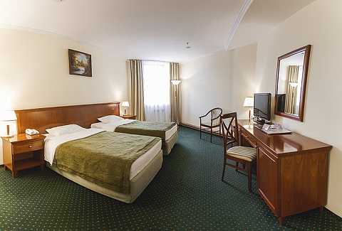 В номере: вешалка, зеркало, кровати полутороспальные, прикроватные тумбочки, стол, стулья, шкаф, кондиционер, сейф, телевизор, телефон