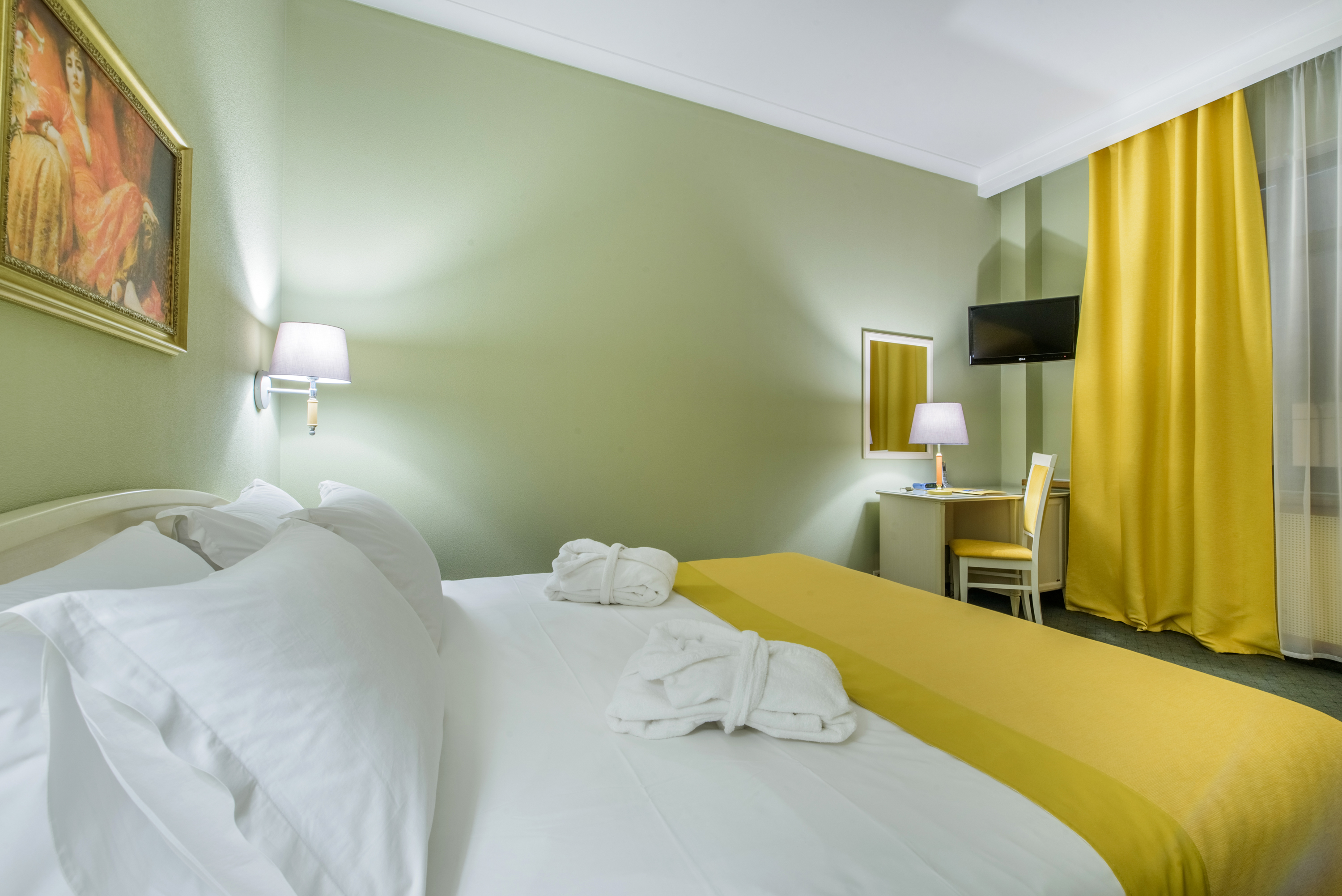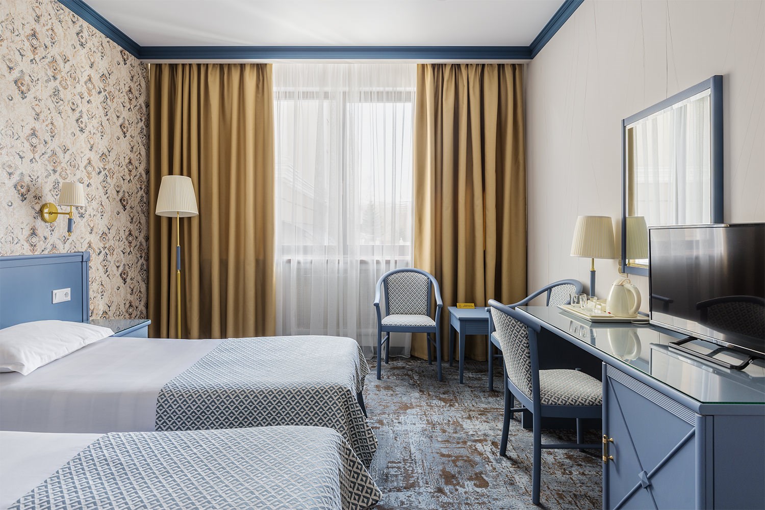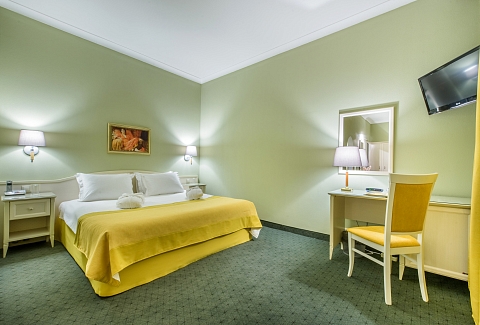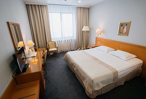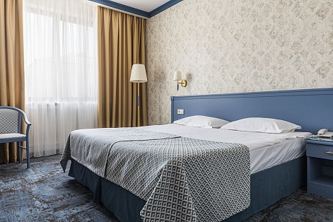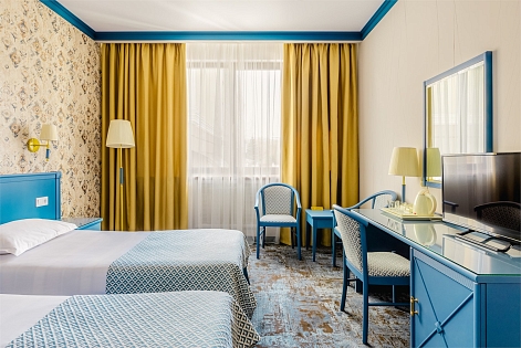 В номере: кровати односпальные /одна двуспальная кровать, прикроватные тумбочки, стол, стулья, шкаф, кондиционер, мини-холодильник, сейф, телевизор, телефон, чайная станция