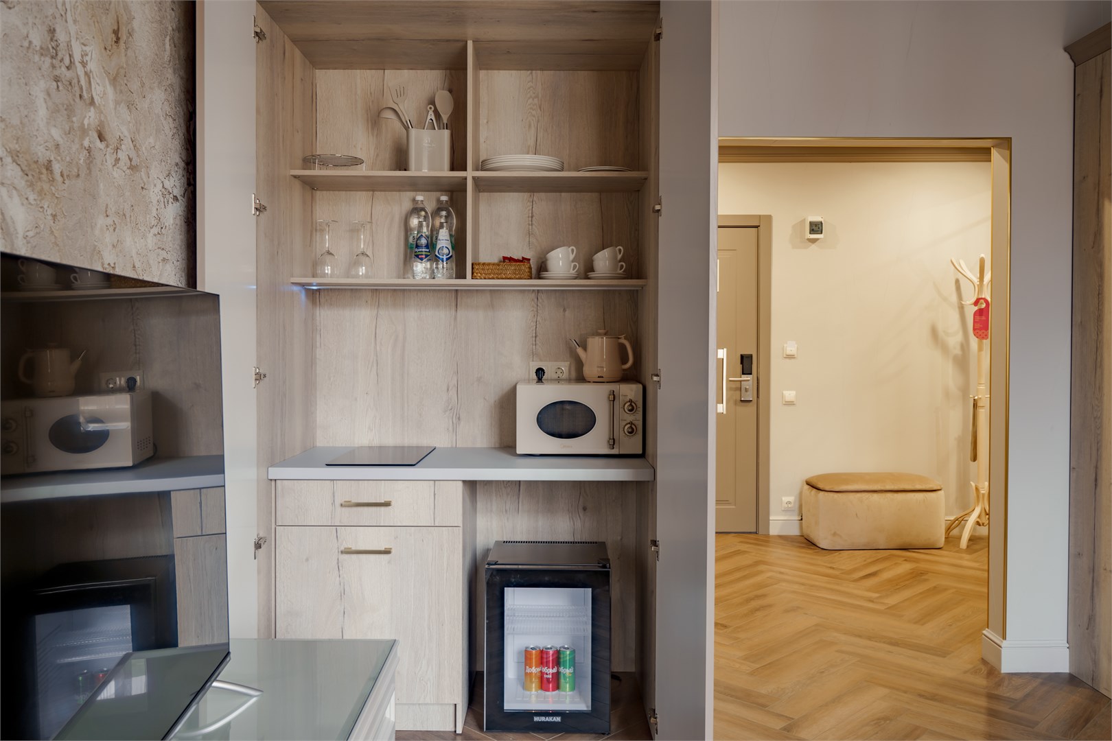 В номере: кровать двуспальная, стол, стулья, шкаф, кондиционер, микроволновая печь, мини-холодильник, набор посуды, плита электрическая, сейф, телевизор, телефон, чайник