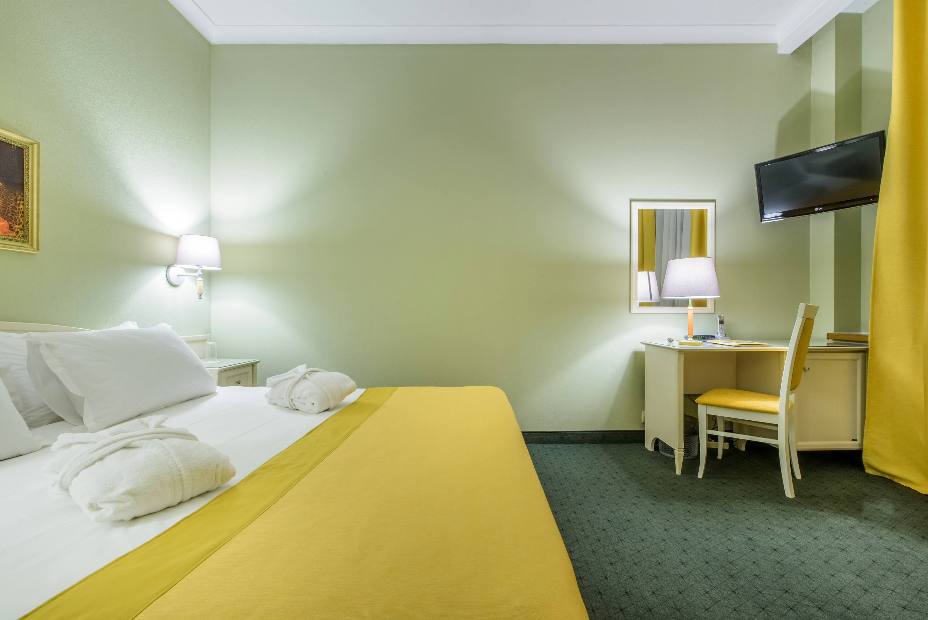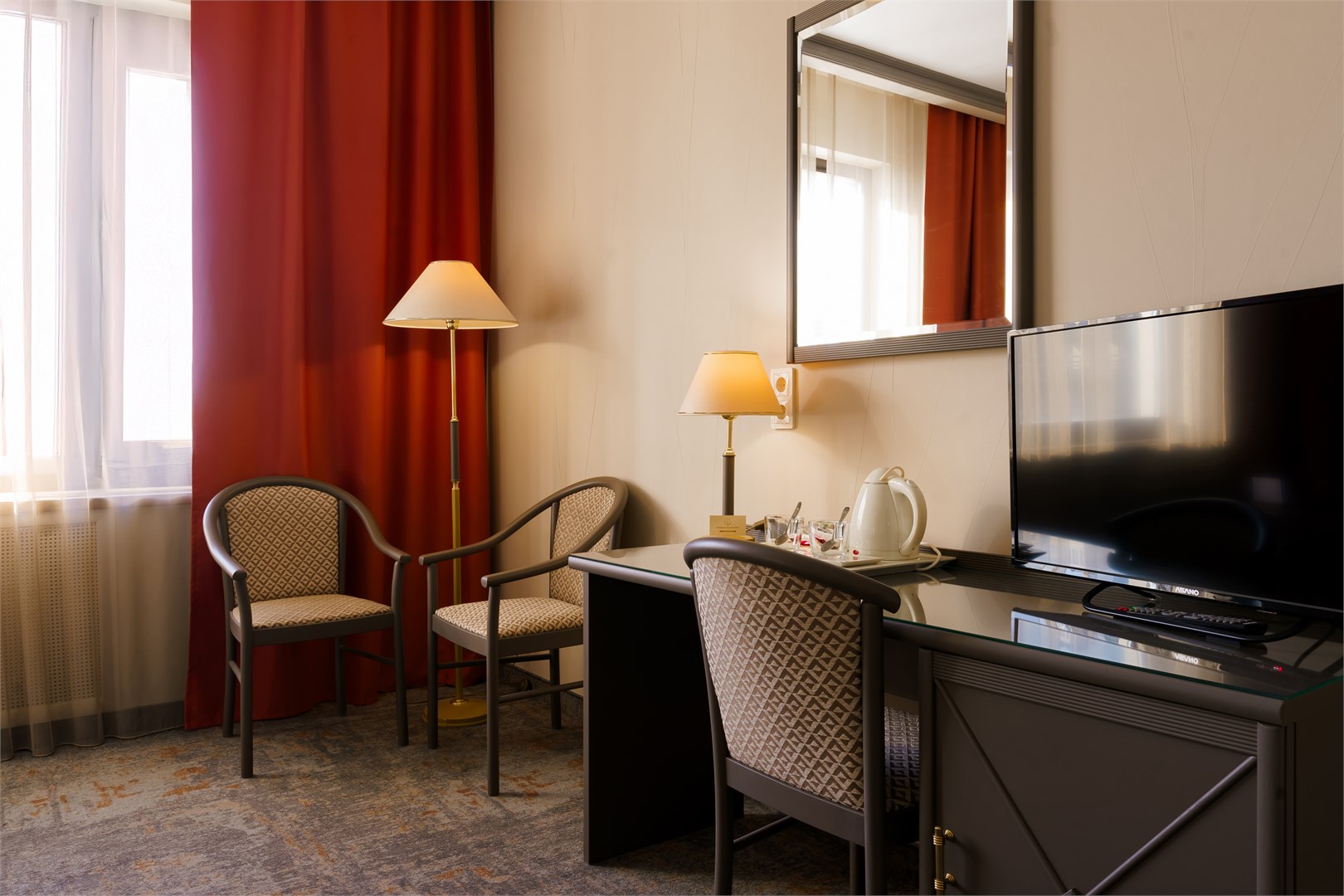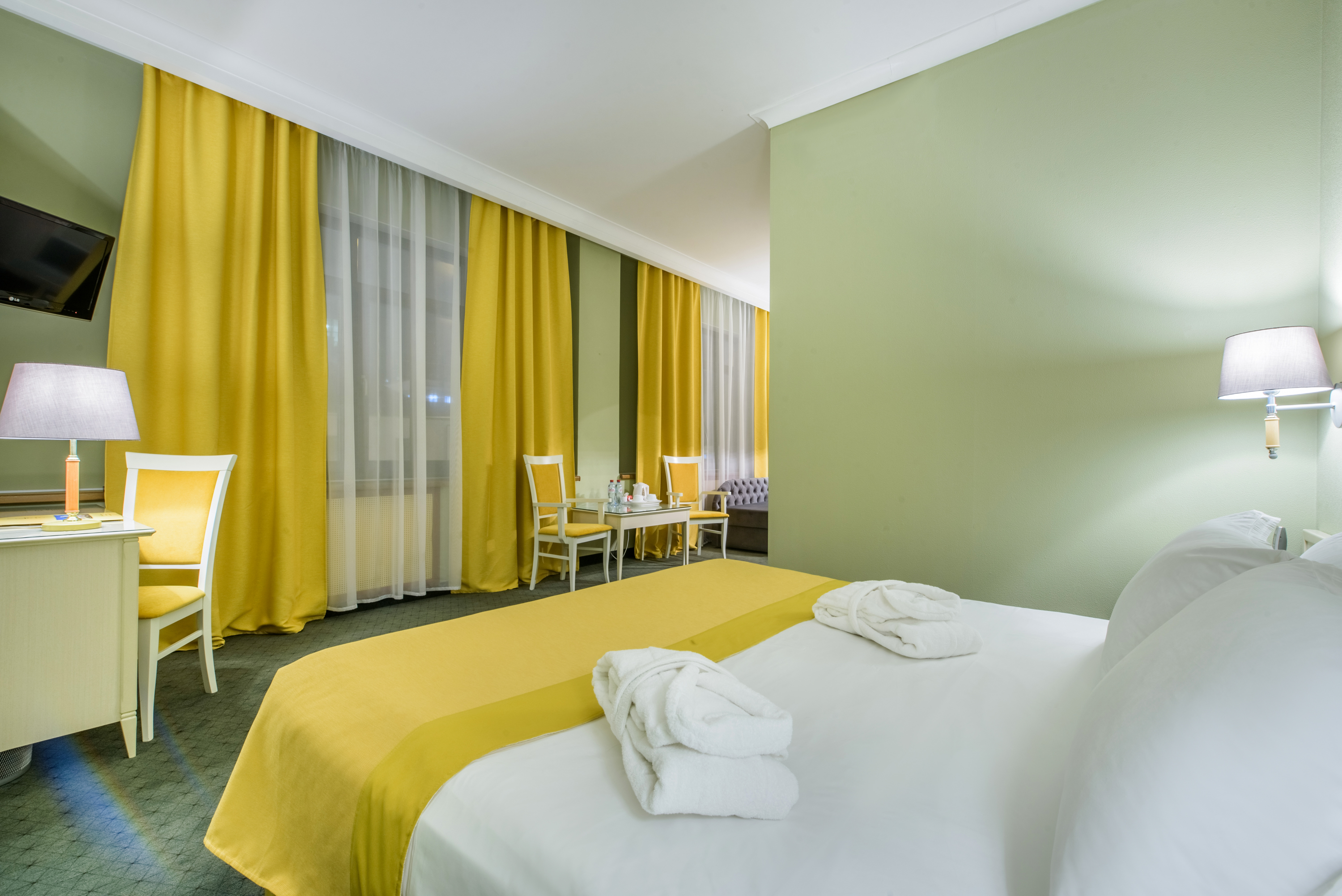 В номере: диван, кровать двуспальная, стол, стулья, шкаф, кондиционер, мини-холодильник, сейф, телевизор, телефон, чайная станция