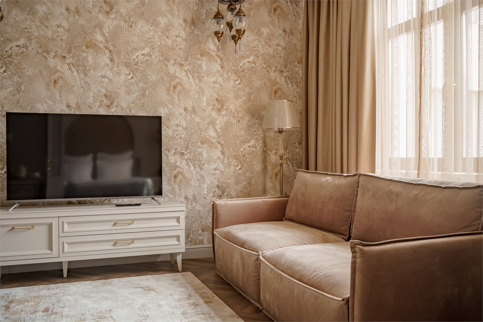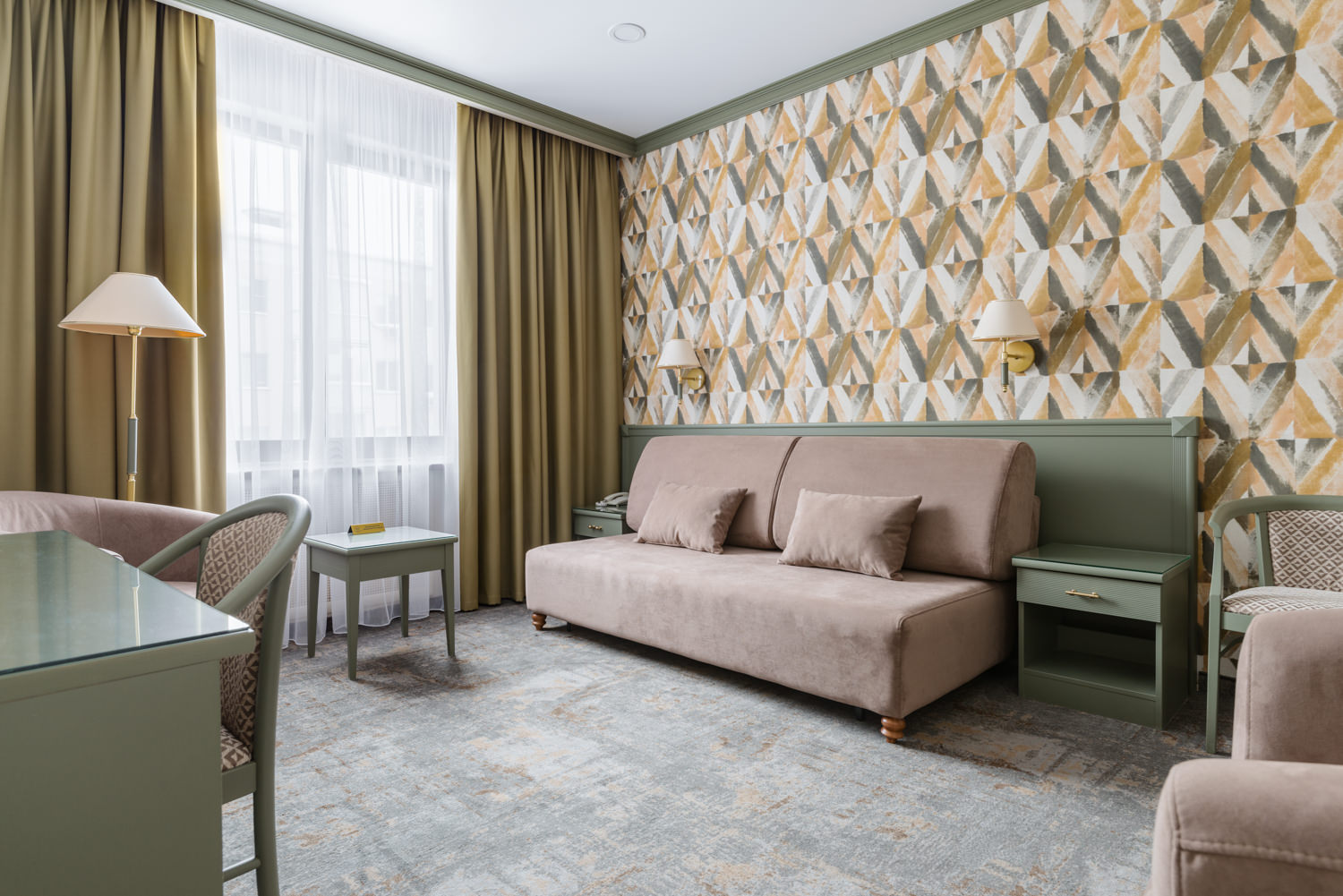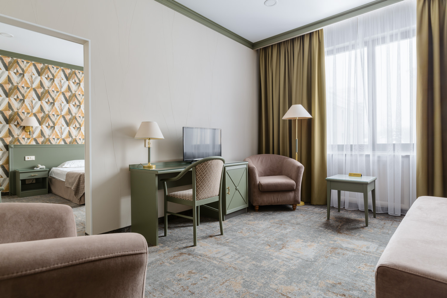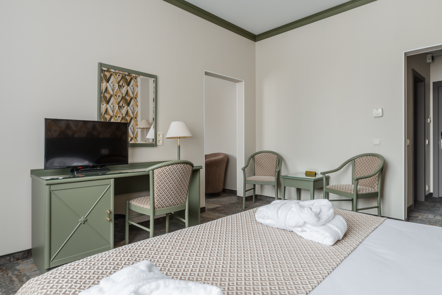 В номере: диван, кровать двуспальная, стол, стулья, шкаф, кондиционер, мини-холодильник, сейф, телевизор, телефон, чайная станция