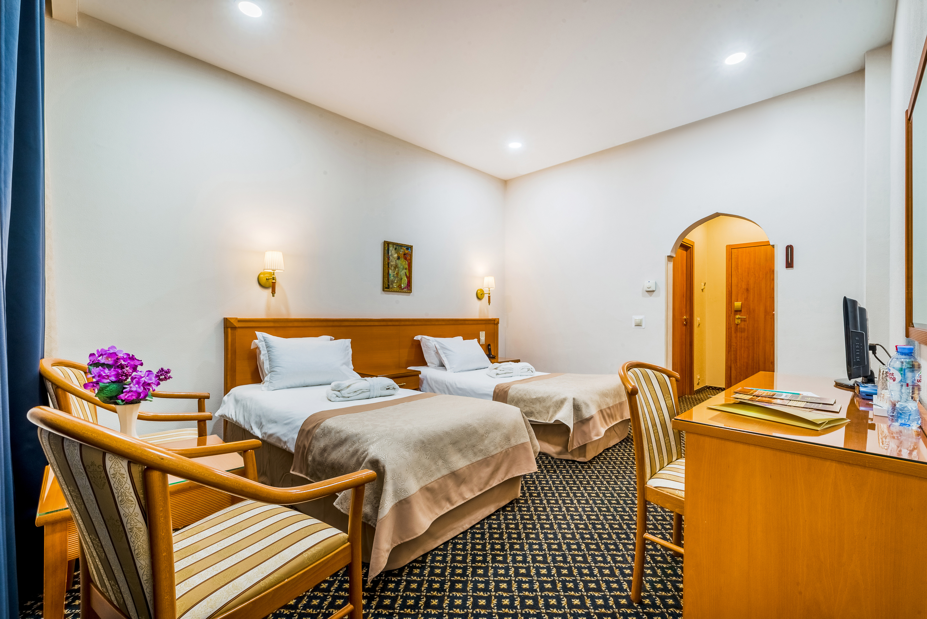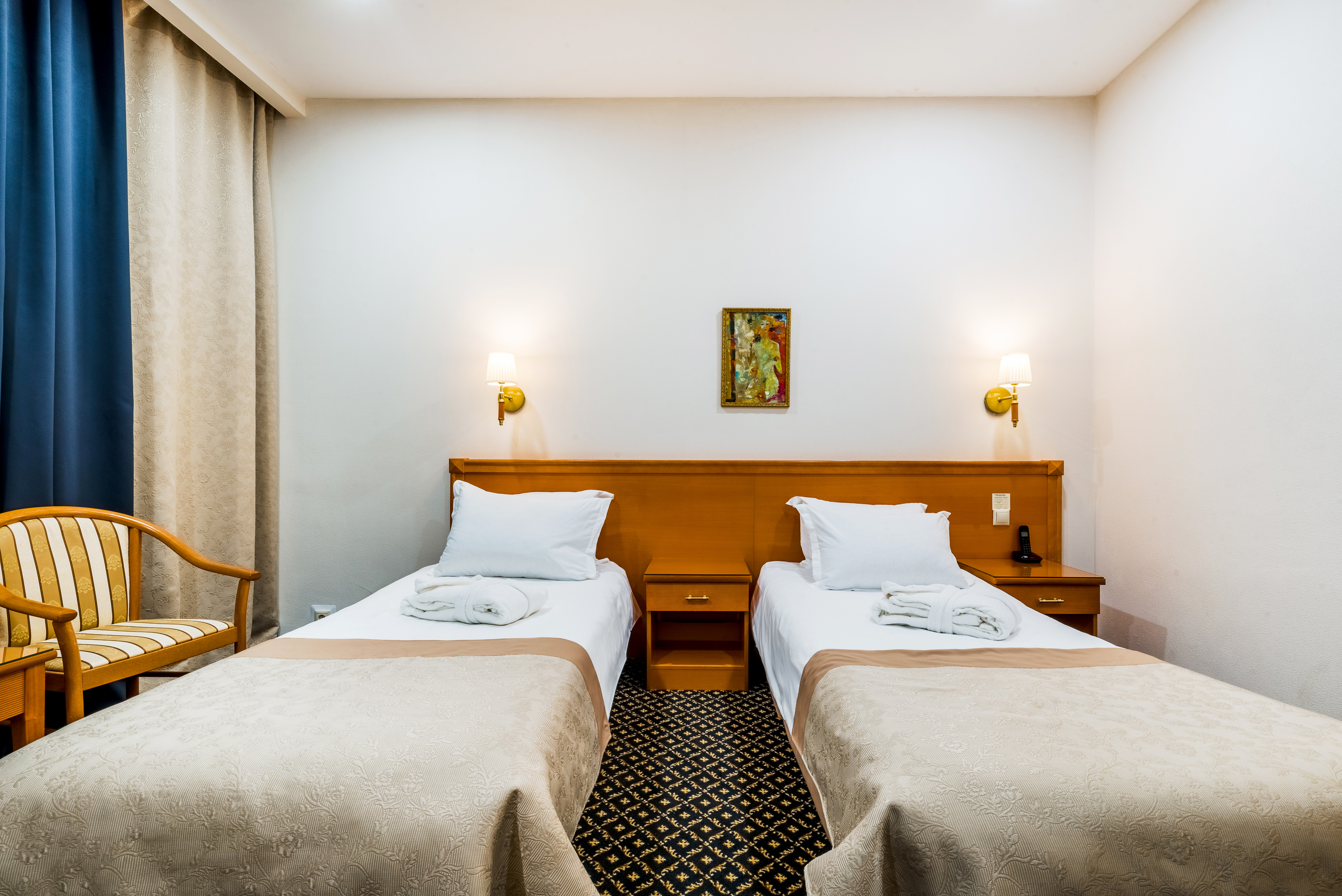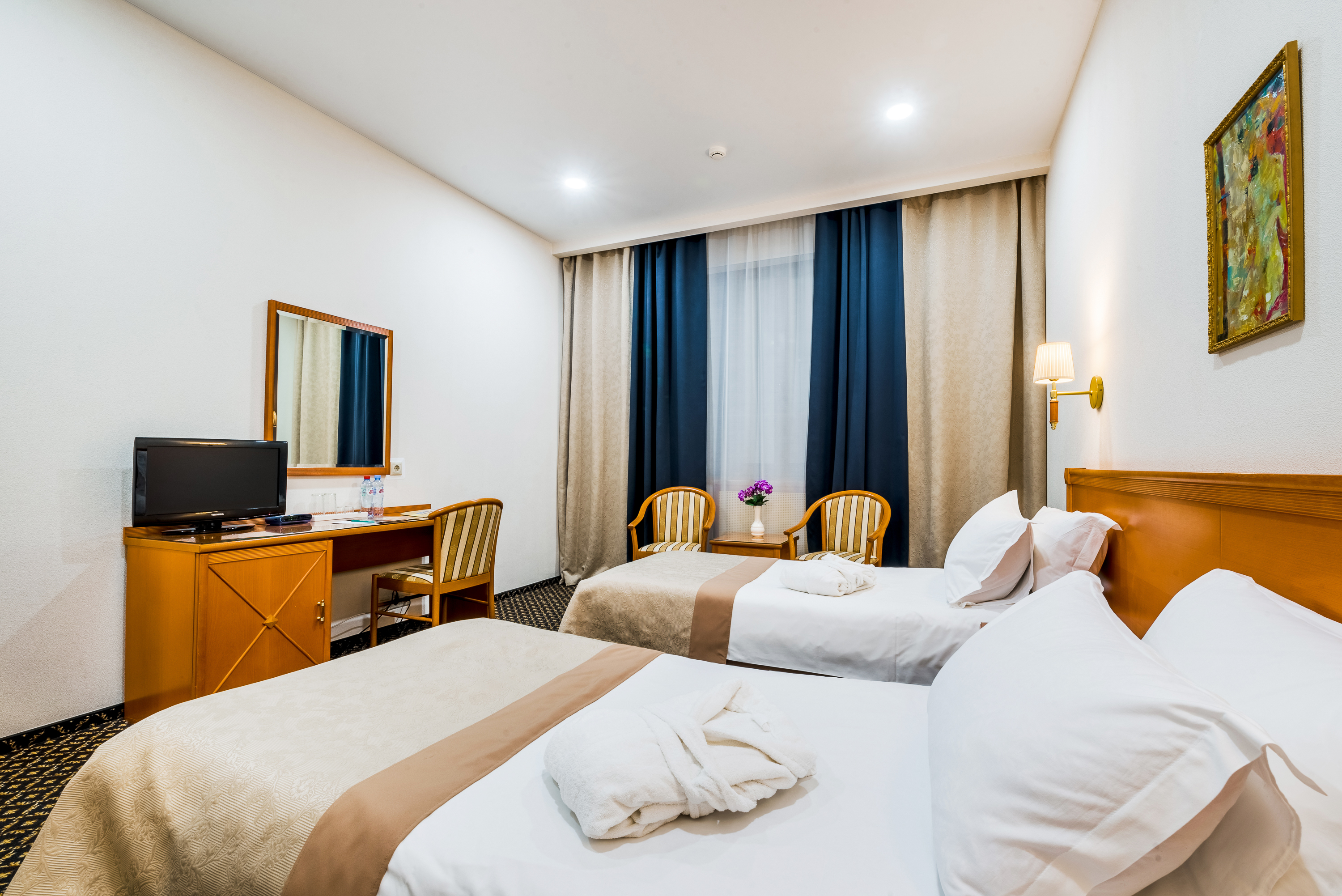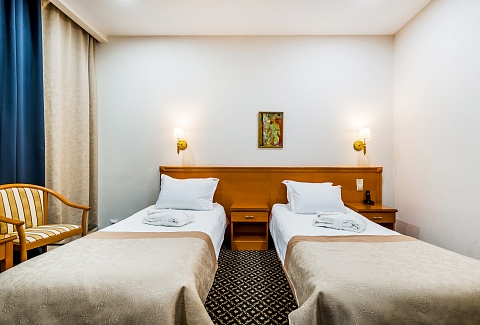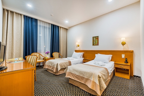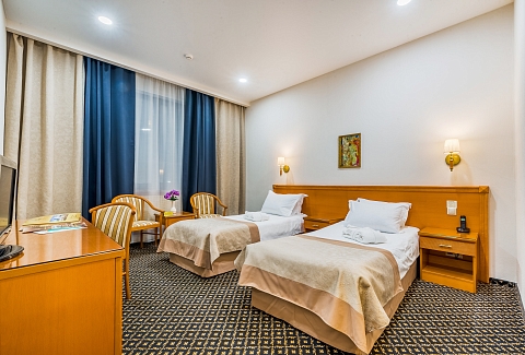 В номере: кровати односпальные, прикроватные тумбочки, стол, стулья, шкаф, кондиционер, мини-холодильник, телевизор, телефон, чайная станция