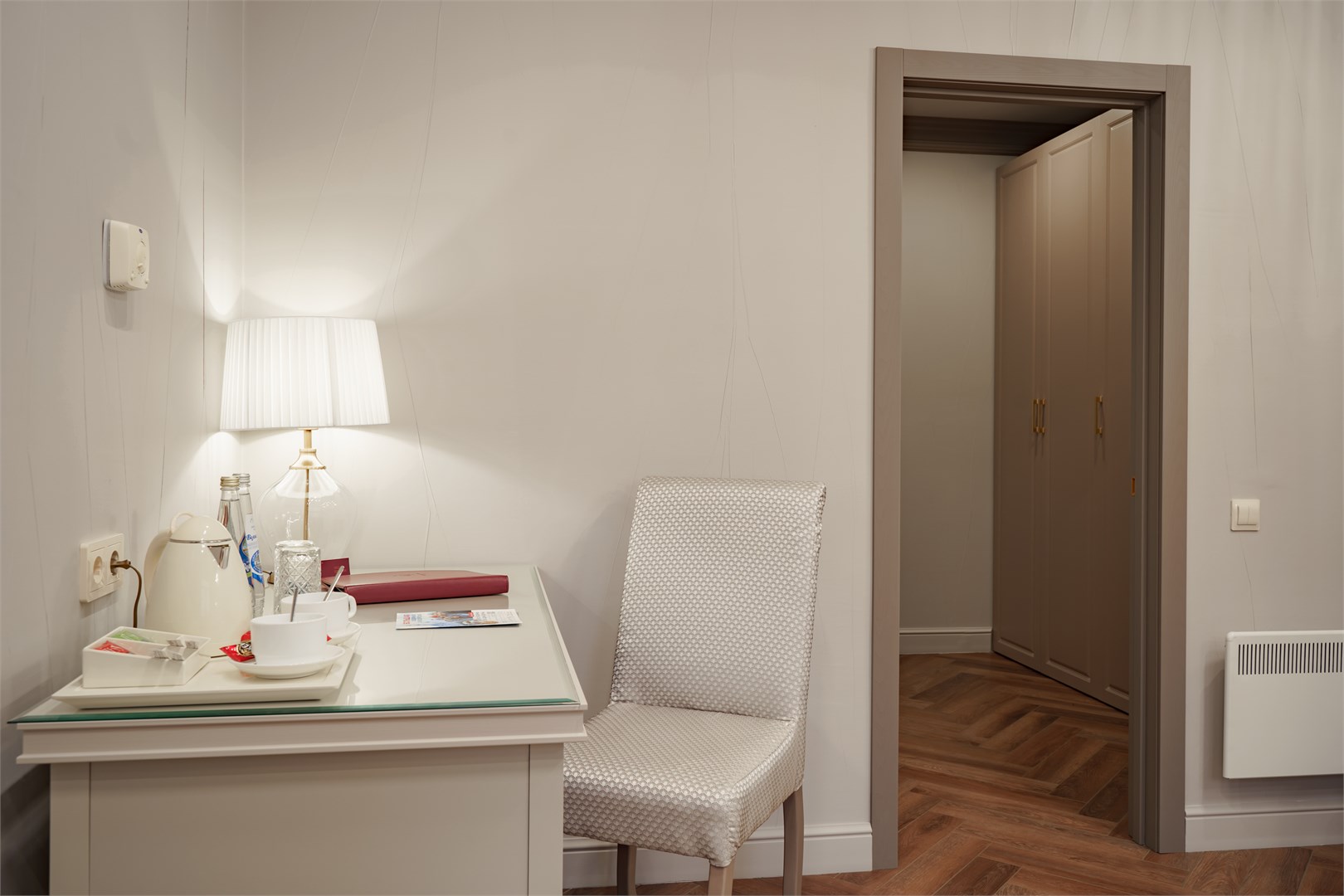 В номере: вешалка, зеркало, кровать двуспальная, набор мягкой мебели, прикроватные тумбочки, стол, стулья, шкаф, кондиционер, сейф, телевизор, телефон, холодильник, чайный набор посуды, электрочайник
