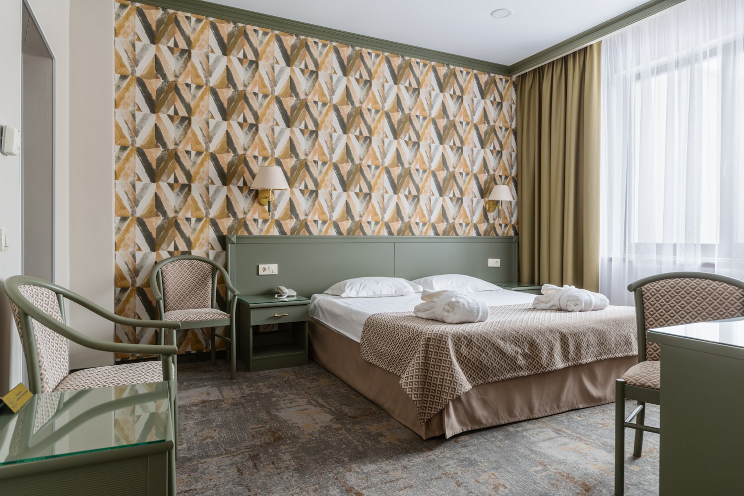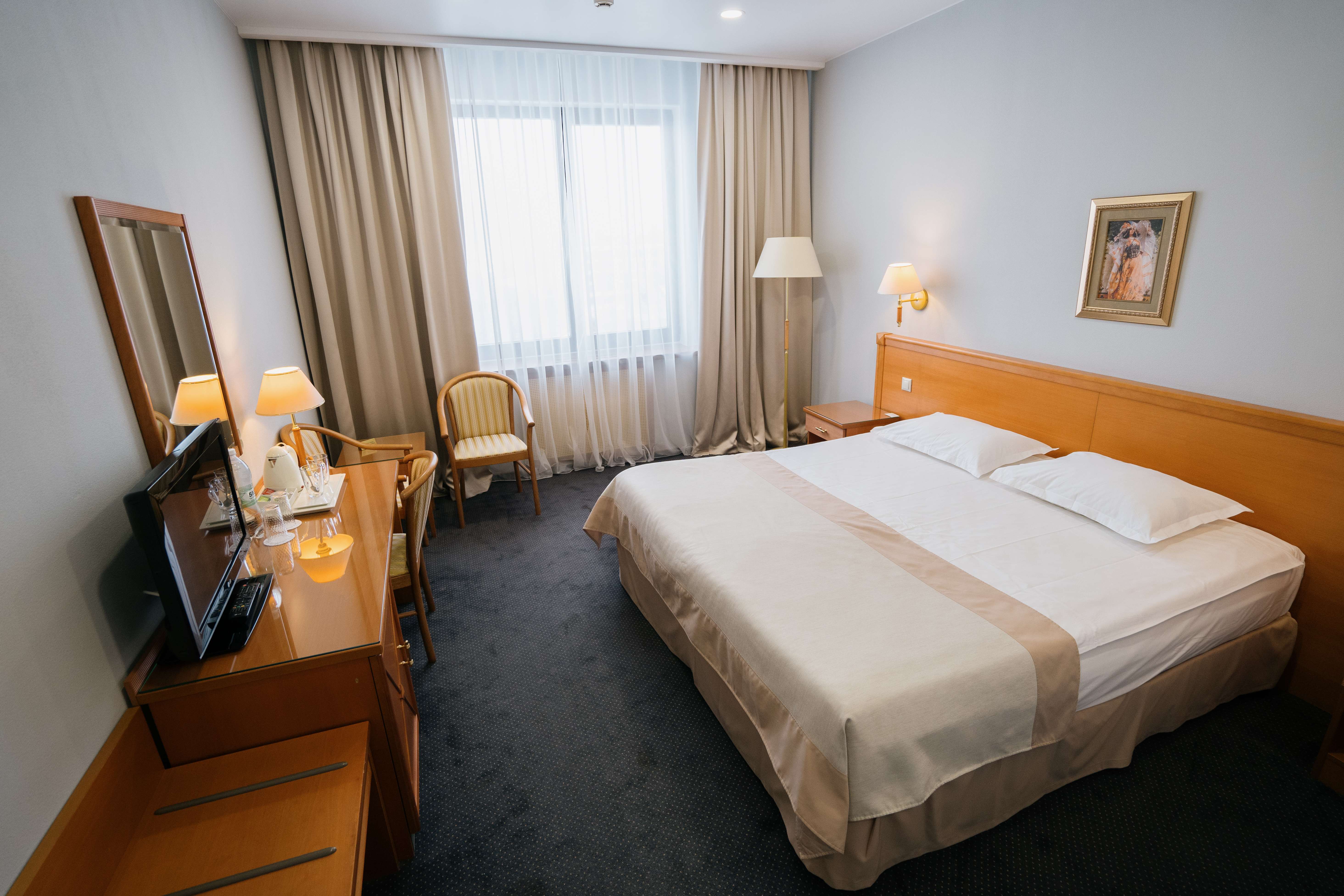 В номере: вешалка, зеркало, кровать двуспальная, прикроватные тумбочки, стол, стулья, шкаф, кондиционер, сейф, телевизор, телефон, холодильник