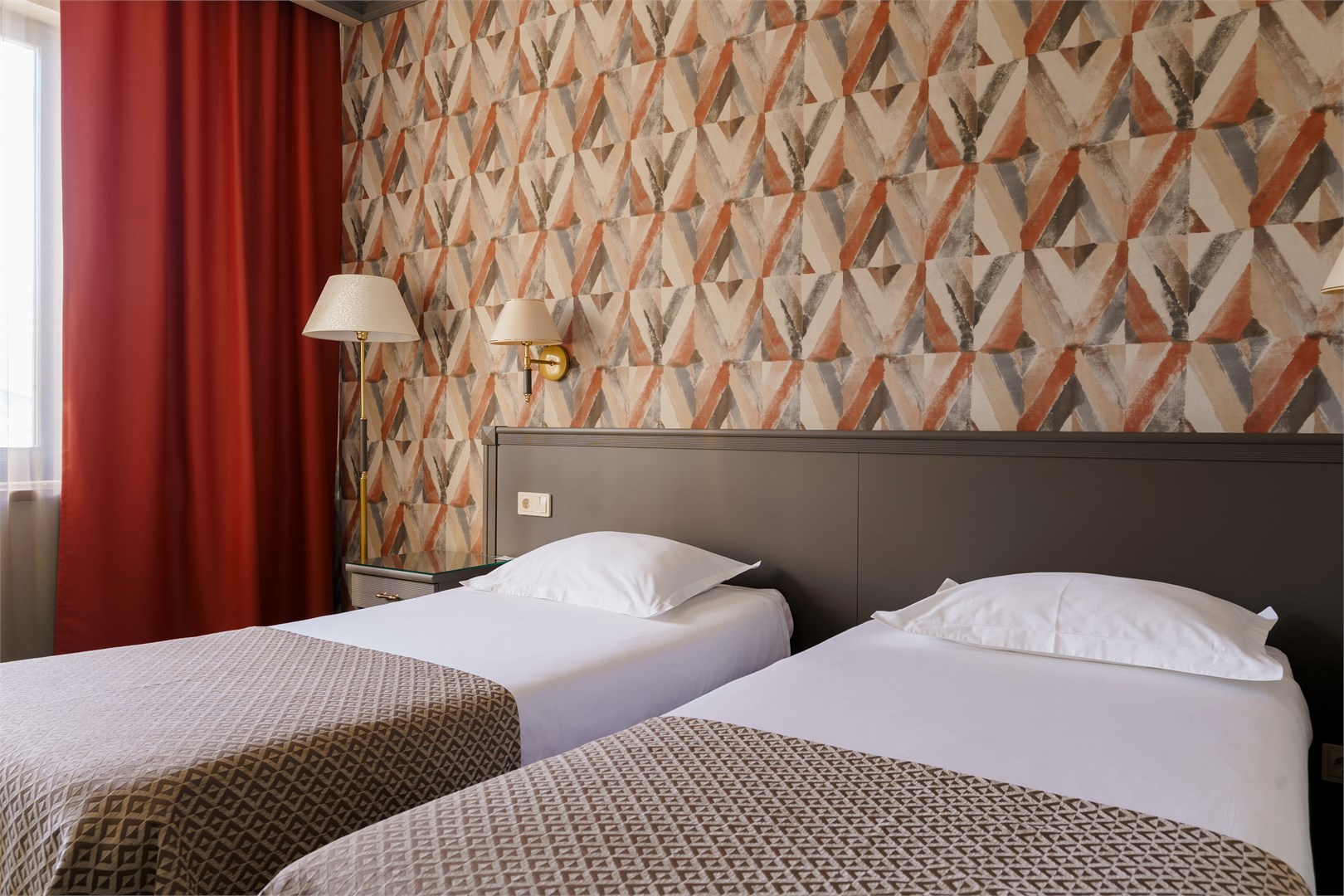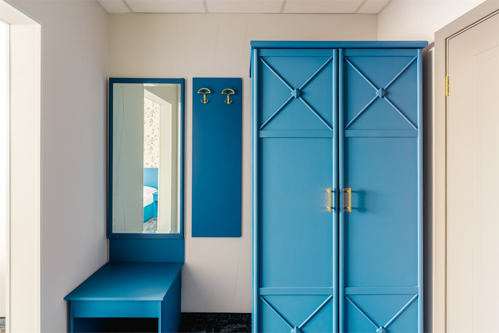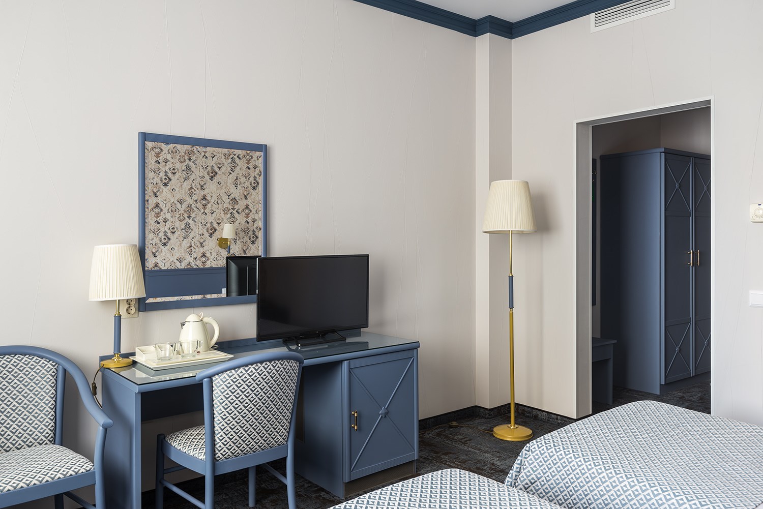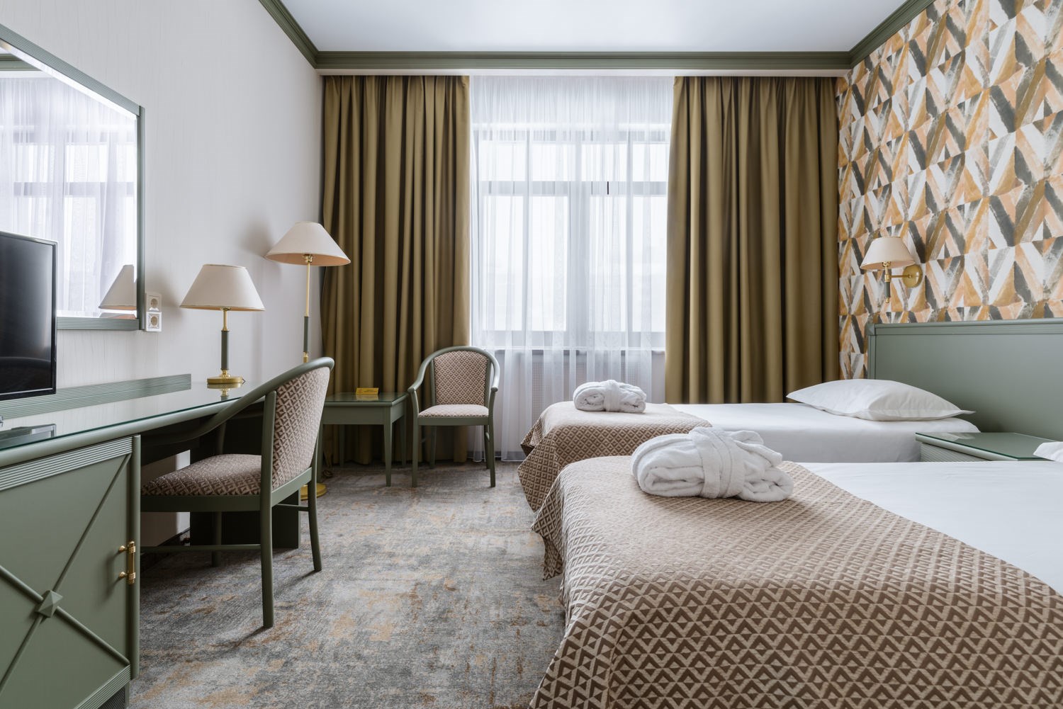В номере: вешалка, зеркало, кровати односпальные, прикроватные тумбочки, стол, стулья, шкаф, кондиционер, сейф, телевизор, телефон, холодильник