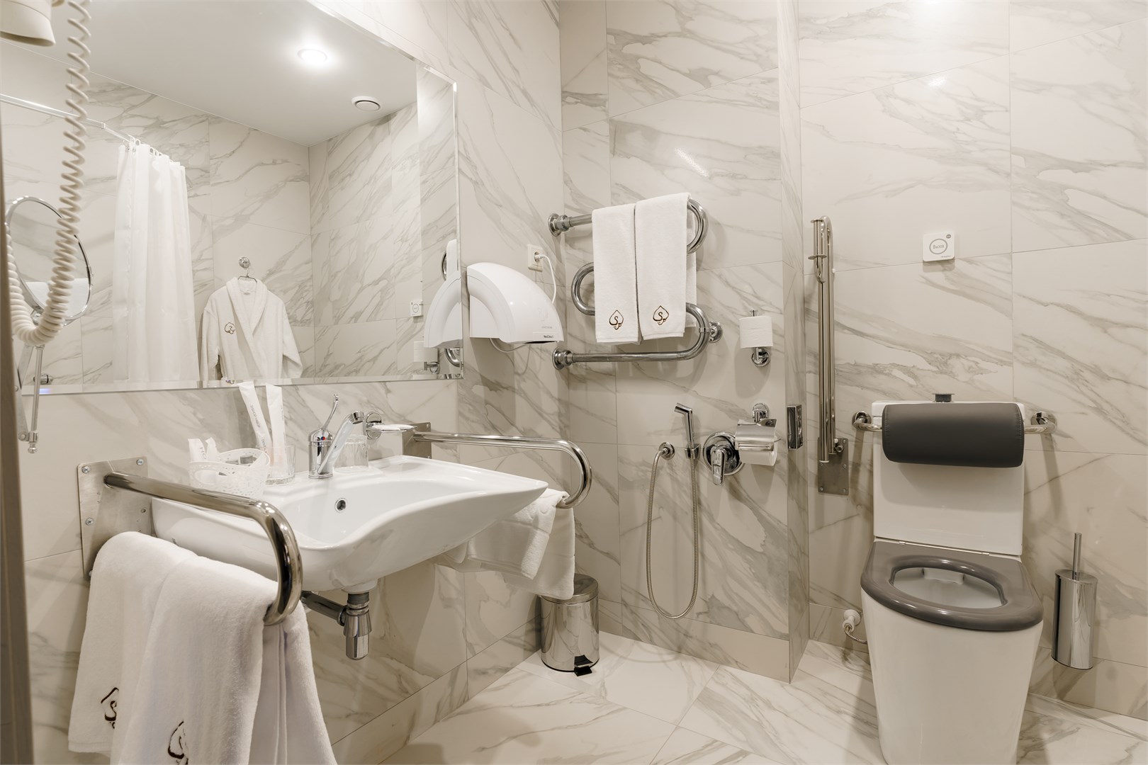 Санузел: с душем, тапочки, туалетные принадлежности, фен, халат