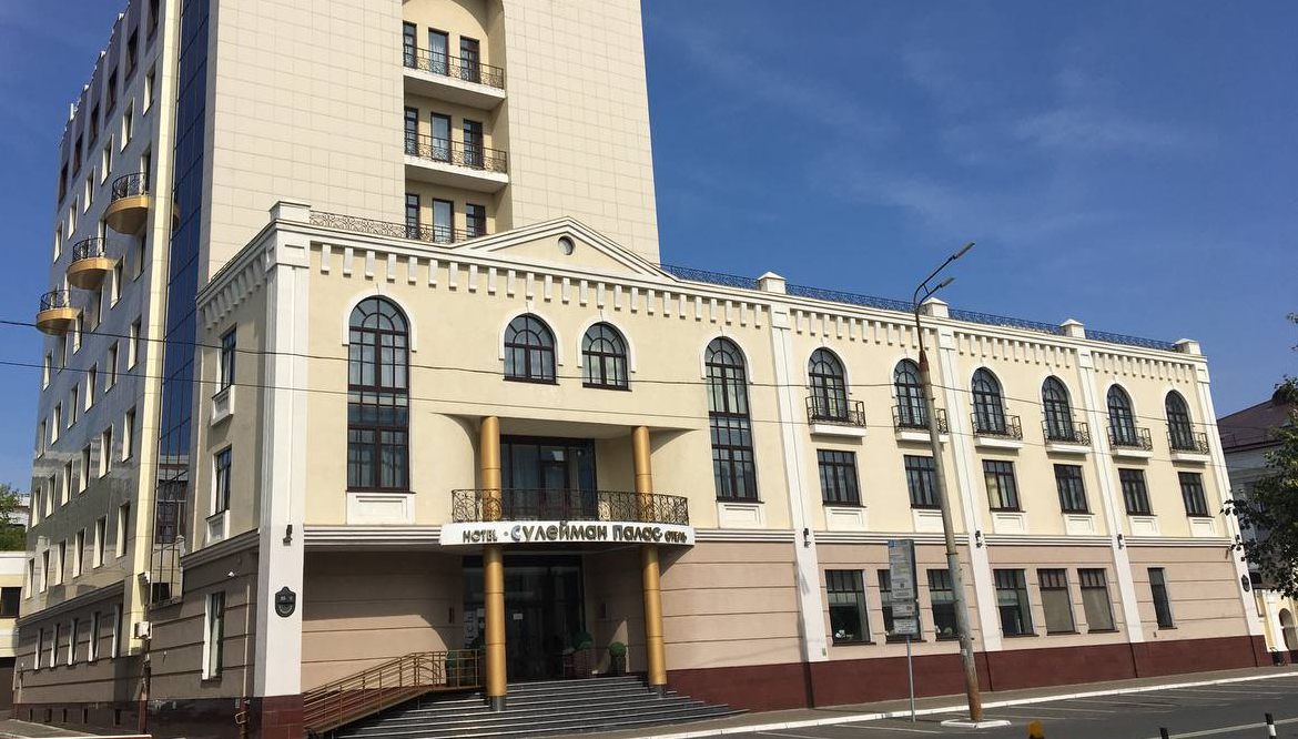Четырехзвездочный отель «Сулейман Палас» расположен в центральном Вахитовском районе Казани рядом с парком 1000-летия Казани и озером Нижний Кабан. До Казанского Кремля и мечети Кул-Шариф – около 7 минут езды на автомобиле, в шаговой доступности – торговые центры, кафе и бары, международный аэропорт находится в 22 километрах, до железнодорожного вокзала – 10 минут пути. 8-ми этажное здание, оснащенное лифтом, возвышается на тихой и спокойной улице города.