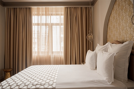 Отель, рассчитанный на размещение 199 человек, предлагает отдыхающим 2-х местные номера категории Стандарт, Повышенной Комфортности, оформленные в классическом стиле, и номера Люкс с элементами восточных мотивов в интерьере. В каждом есть кондиционер, телевизор, холодильник, санузел с ванной. В отеле работают сауна, мини-бассейн с пресной водой, фитнес-центр. Отдыхающим доступны услуги прачечной, беспроводной интернет, охраняемая автостоянка возле корпуса. Для деловых мероприятий организован конференц-зал, способный вместить до 170 человек.