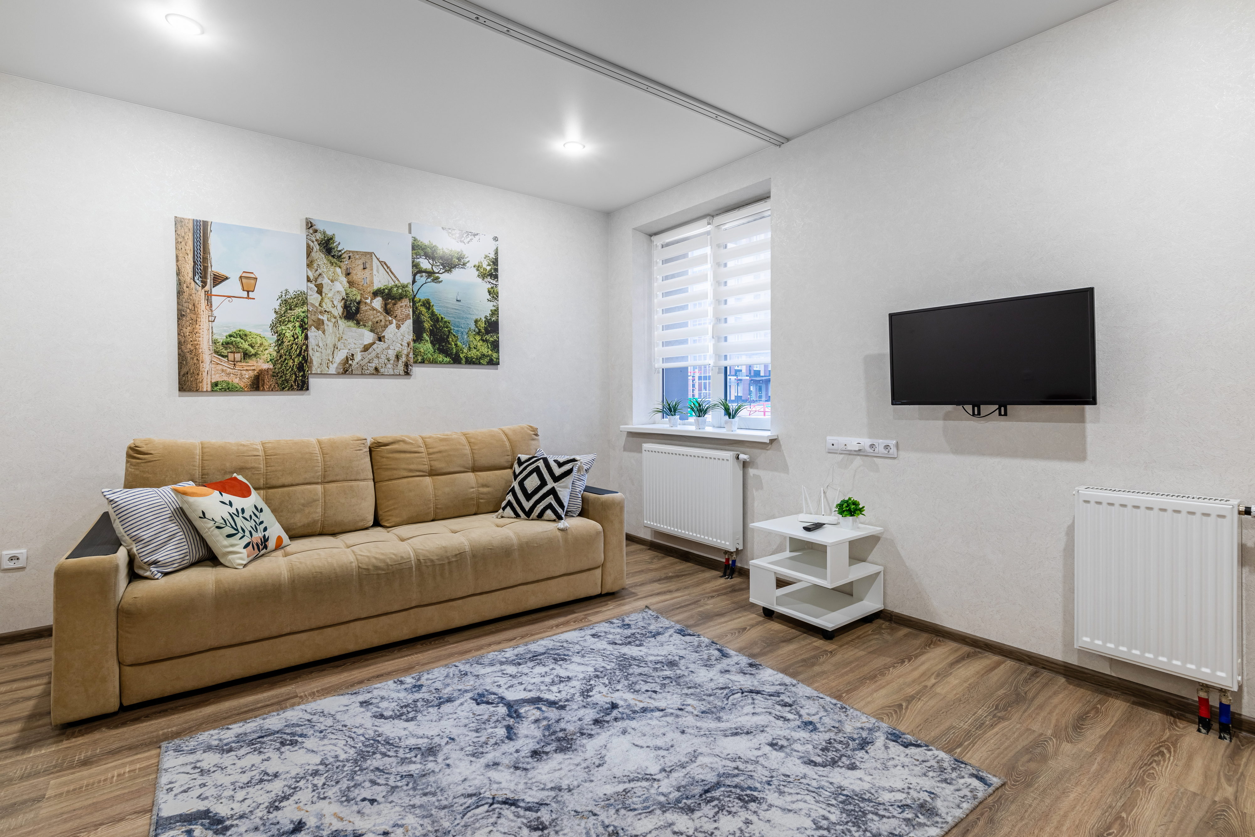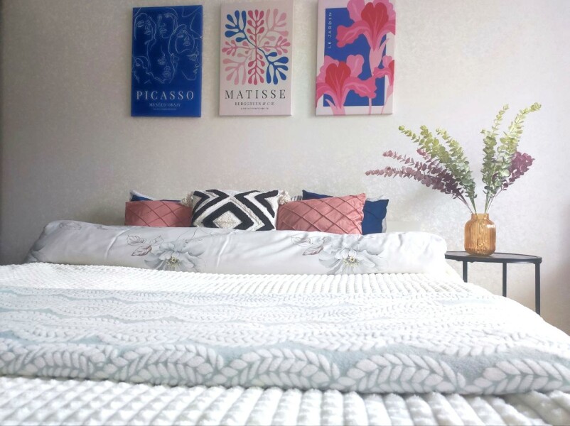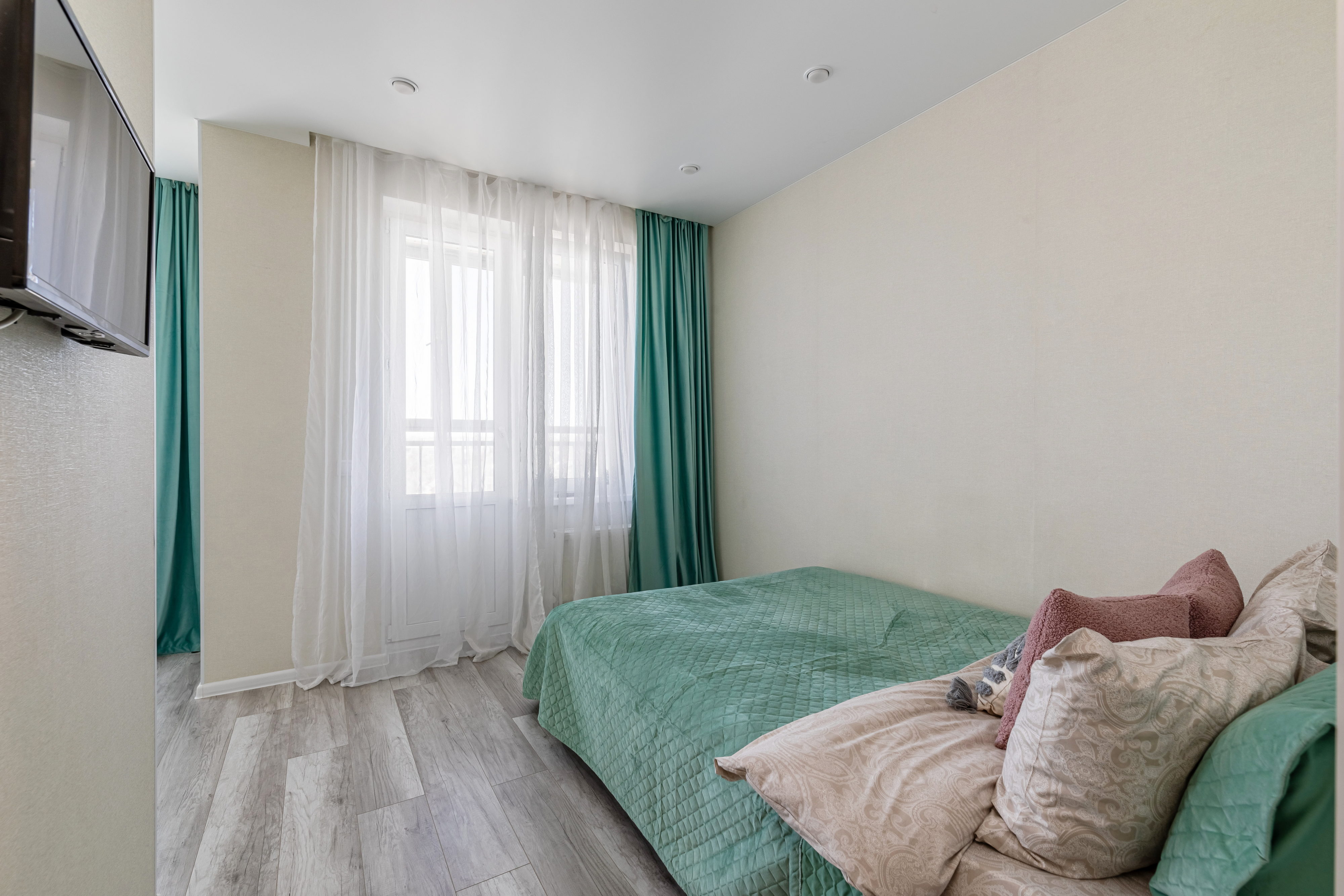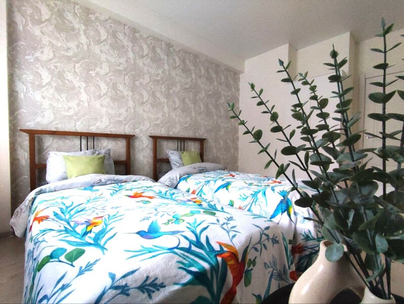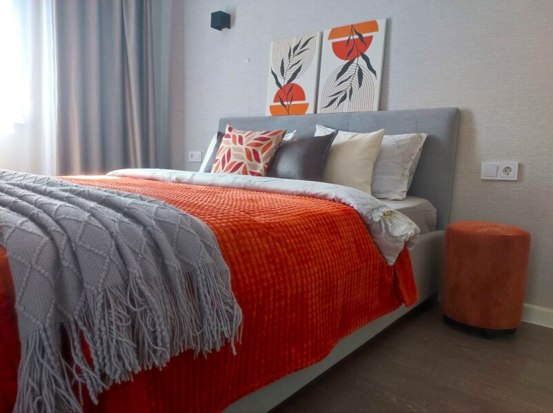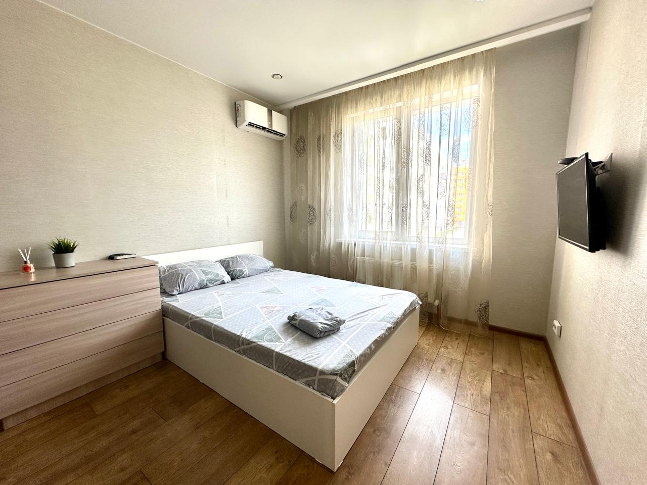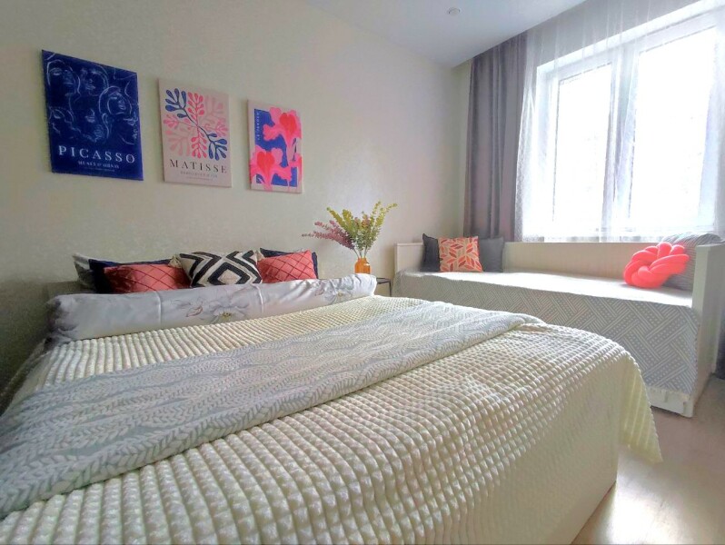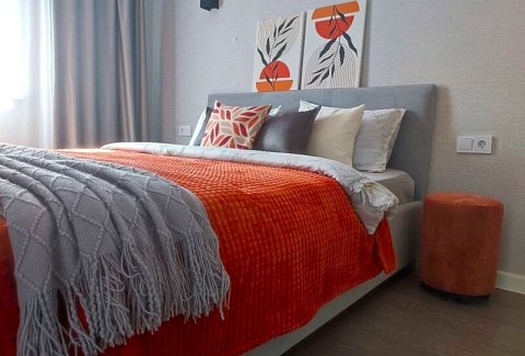 В номере: диван раскладной, кровать двуспальная, прикроватные тумбочки, стол, стулья, шкаф, микроволновая печь, набор посуды, плита электрическая, стиральная машина, телевизор, холодильник, чайник