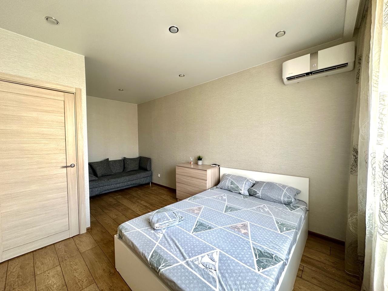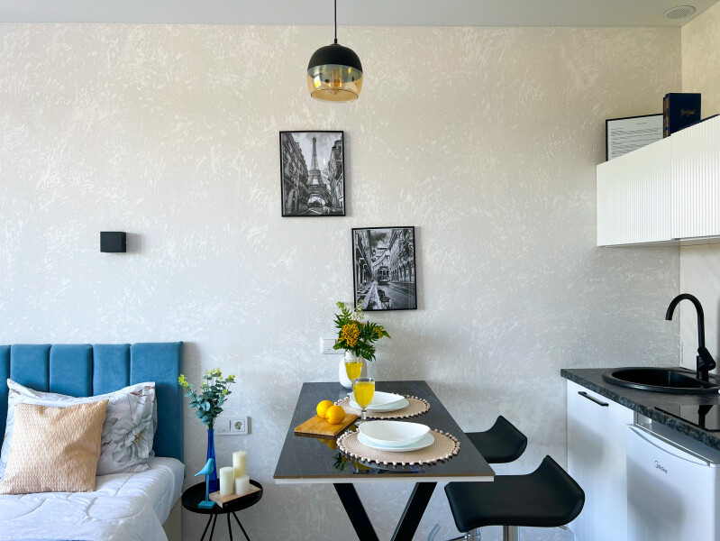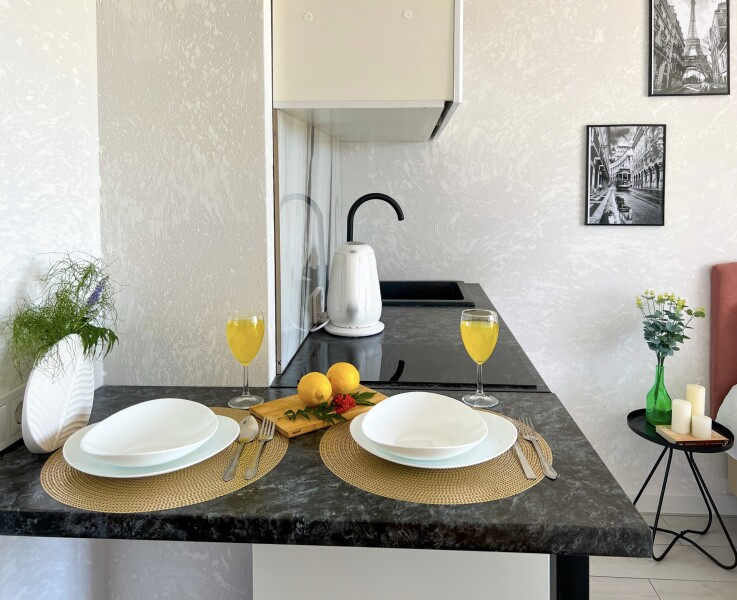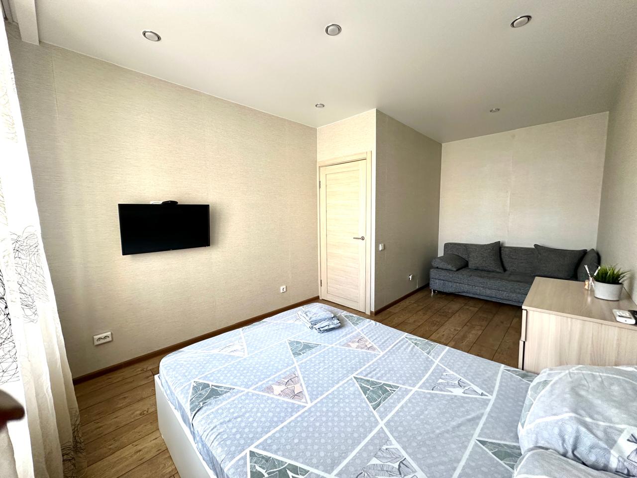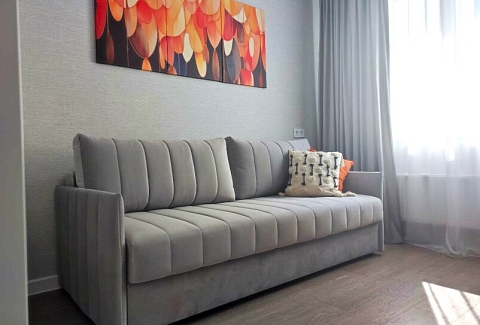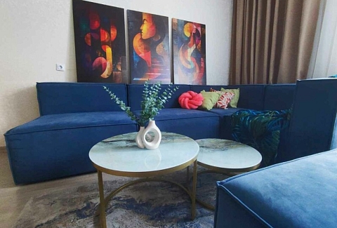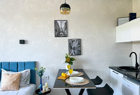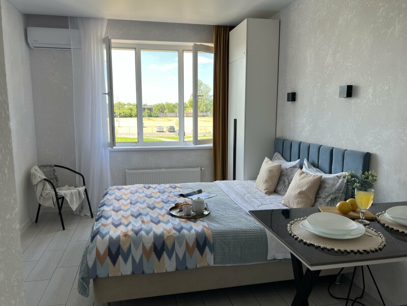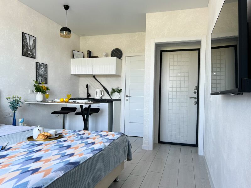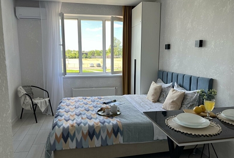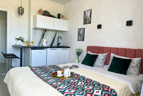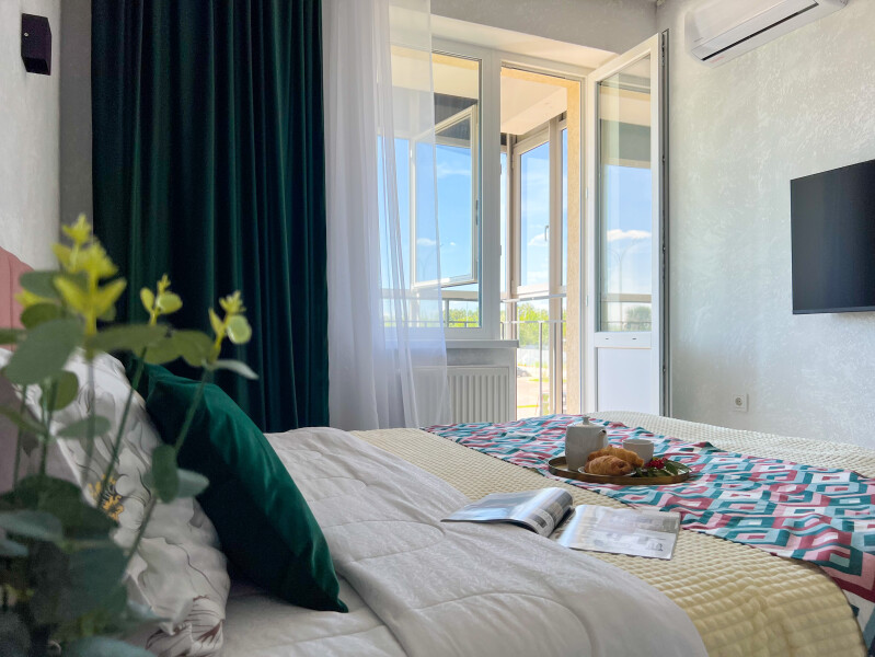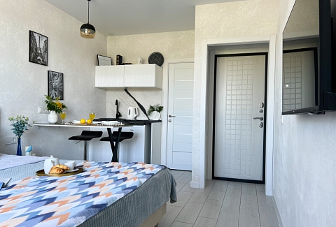 В номере: диван раскладной, стол, стулья, шкаф, кондиционер, микроволновая печь, набор посуды, плита электрическая, стиральная машина, телевизор, холодильник, чайник