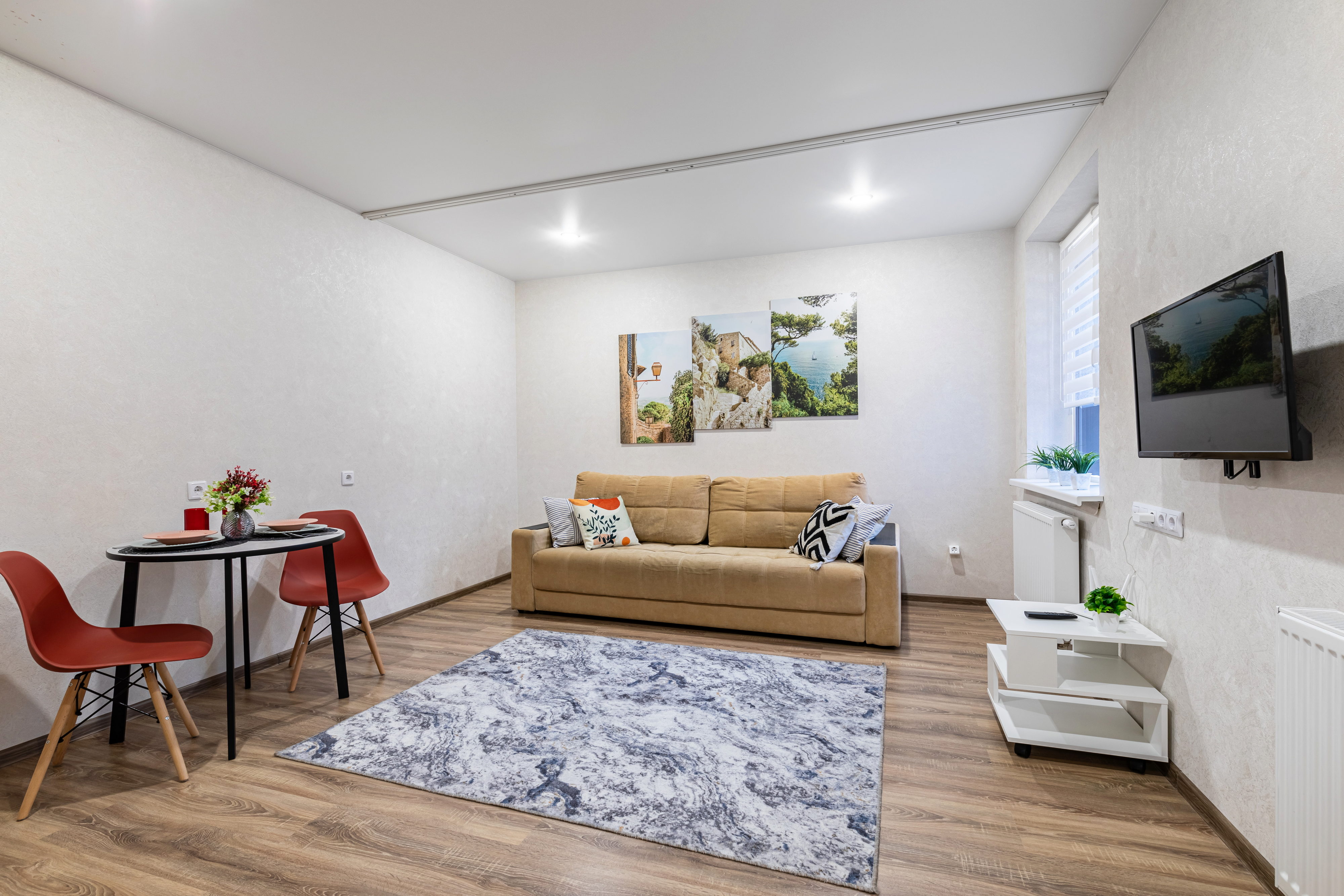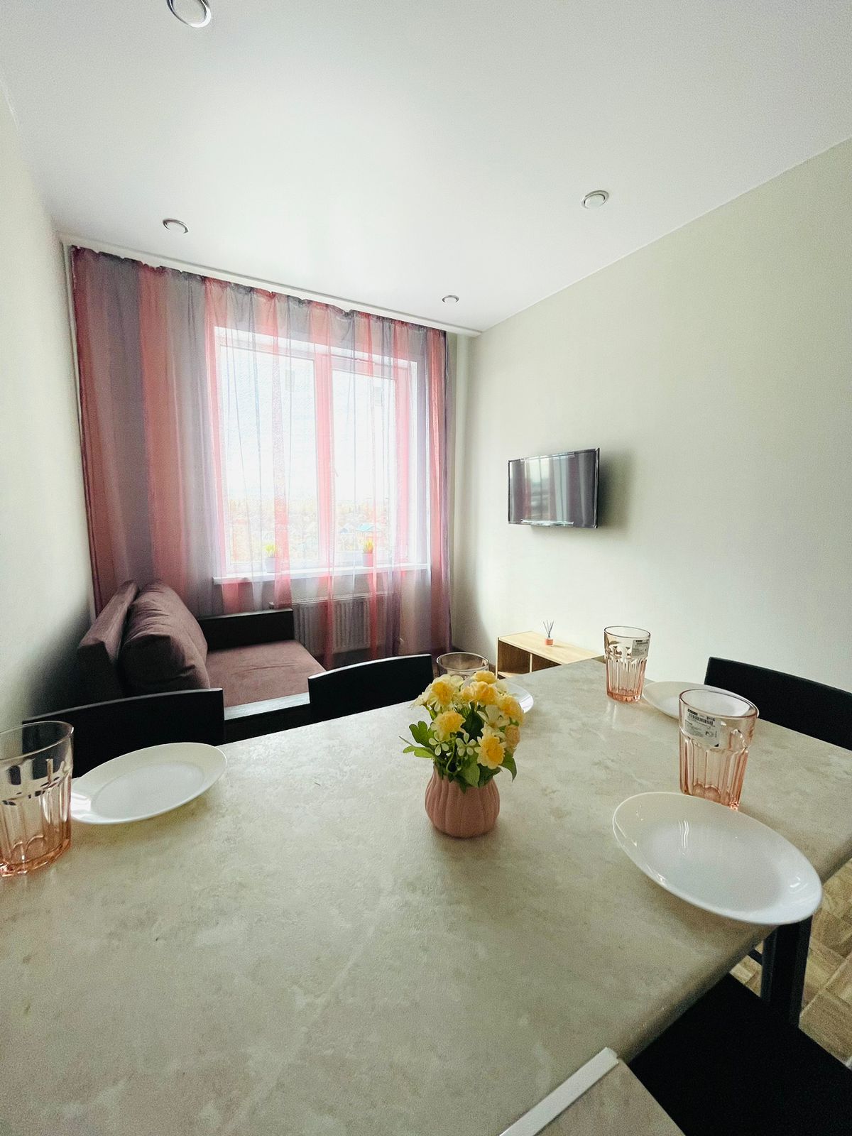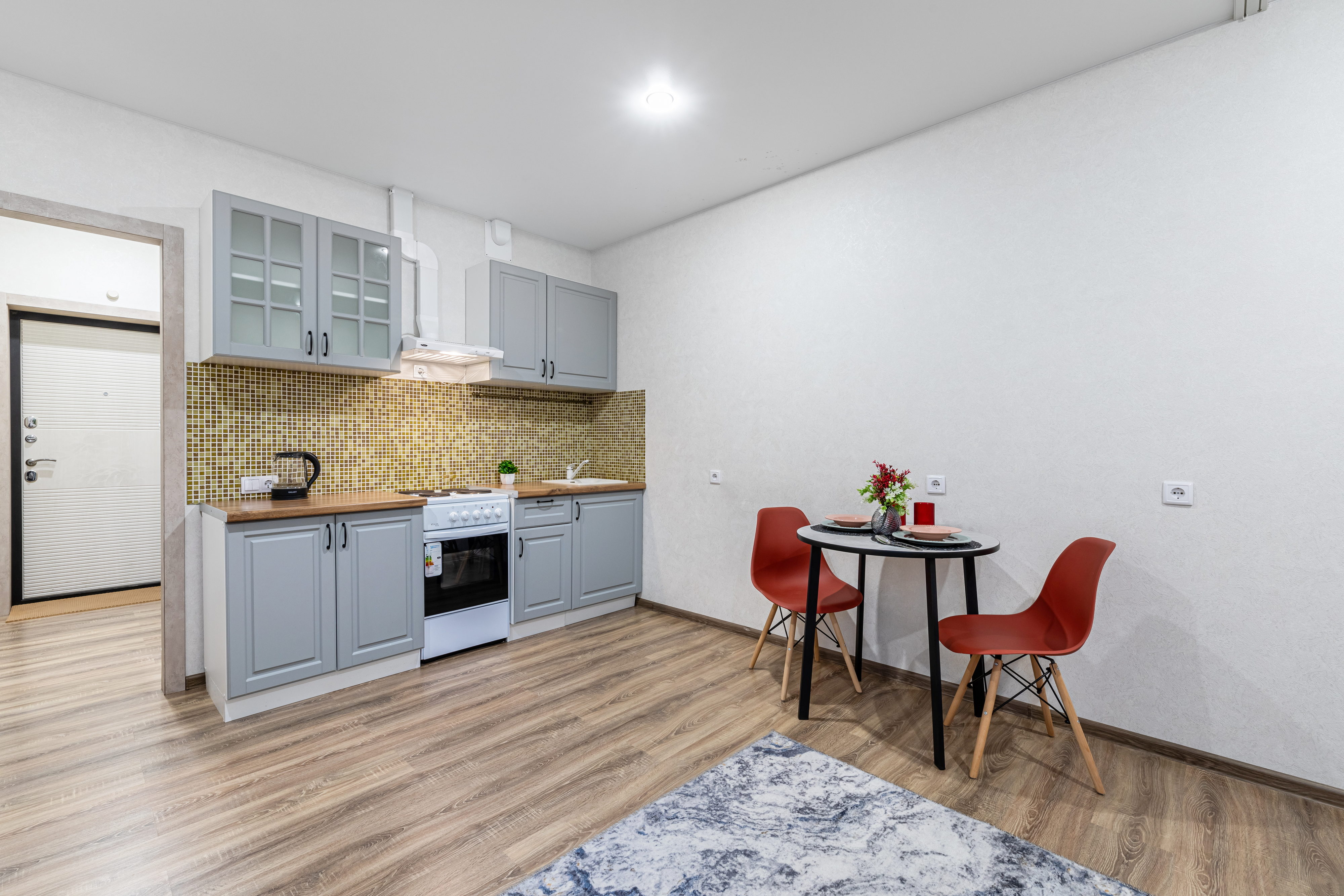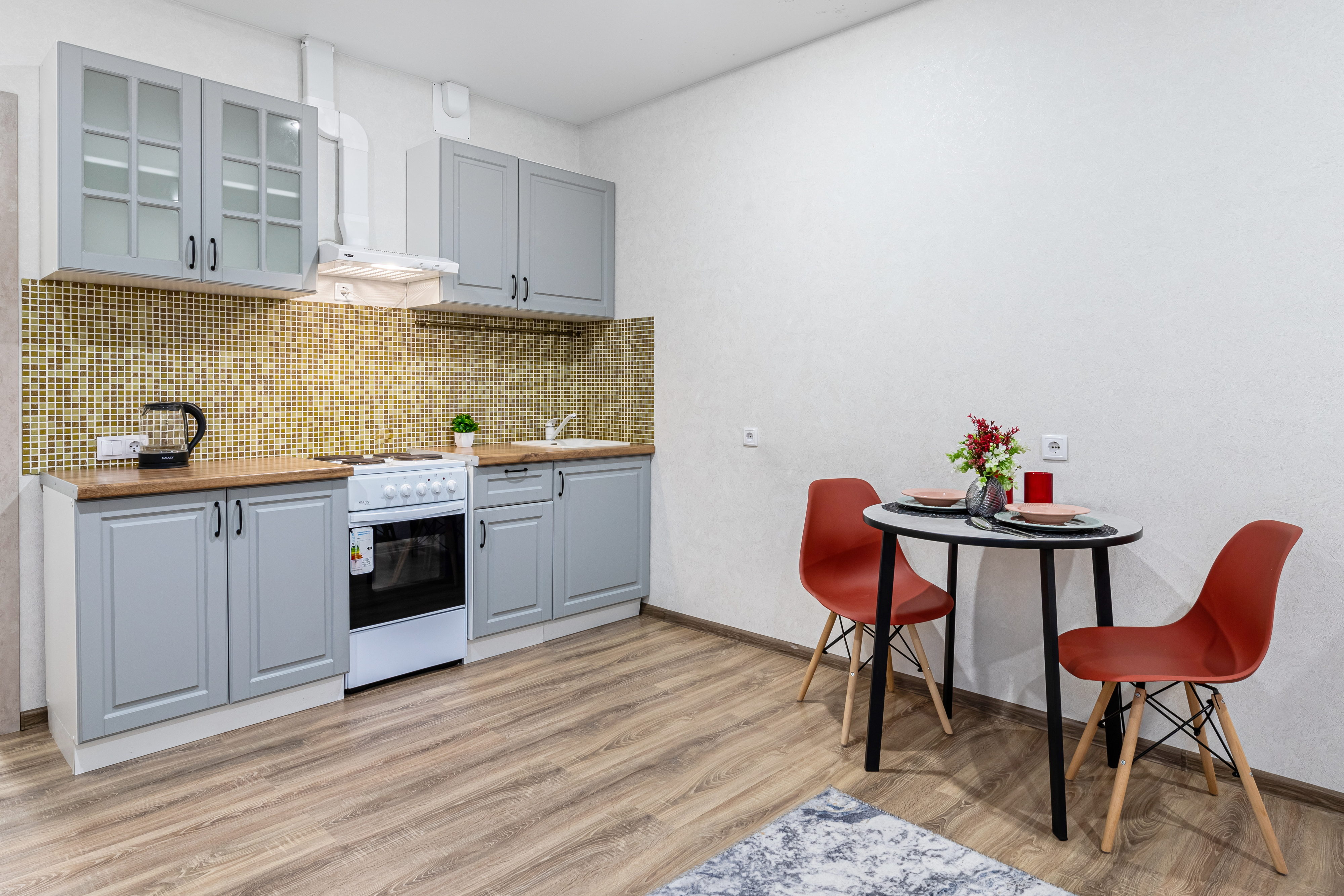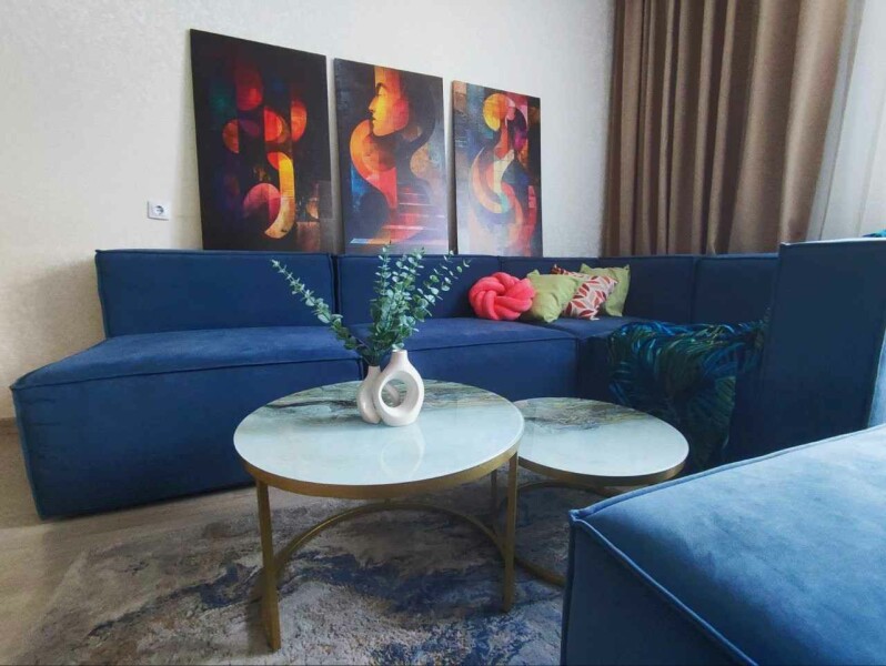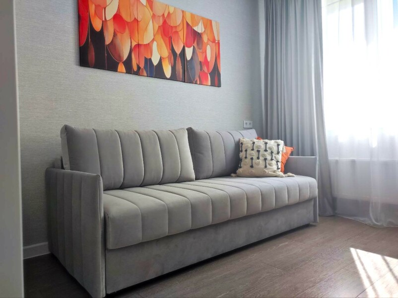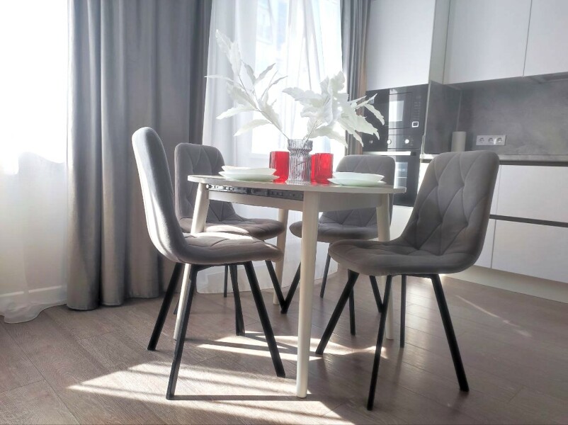 В номере: диван раскладной, стол, стулья, шкаф, кондиционер, микроволновая печь, набор посуды, плита электрическая, стиральная машина, телевизор, холодильник, чайник