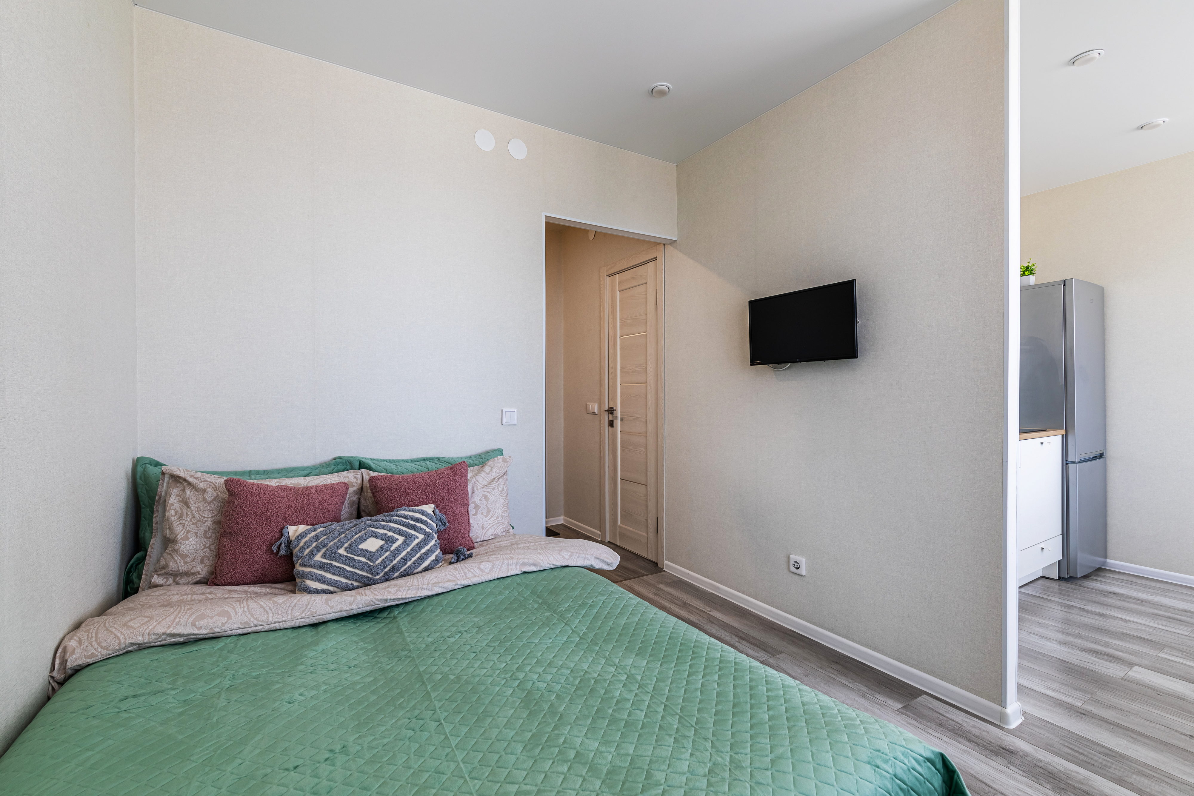 В номере: кровать двуспальная, стол, стулья, шкаф, микроволновая печь, набор посуды, плита электрическая, стиральная машина, телевизор, холодильник, чайник