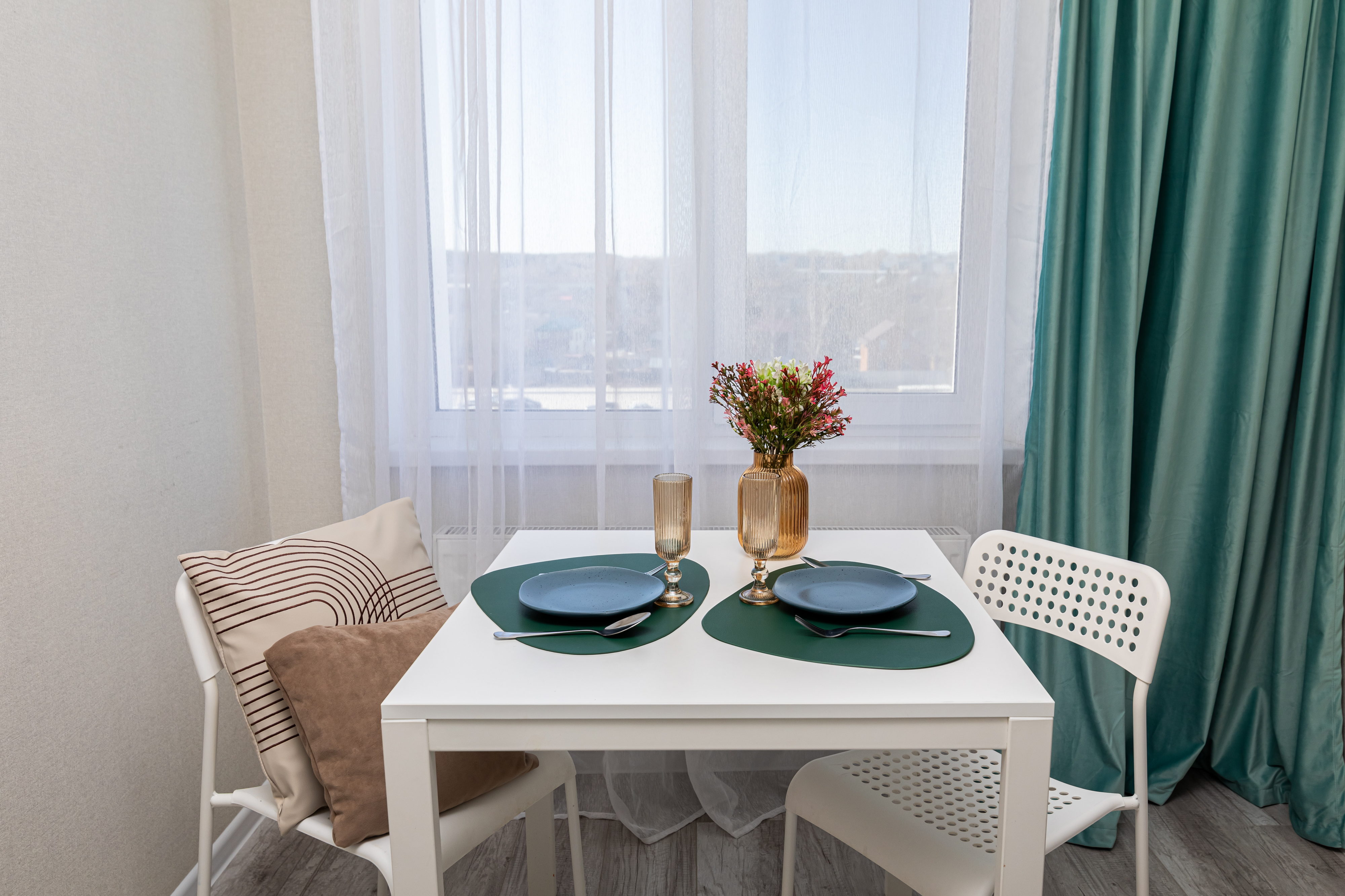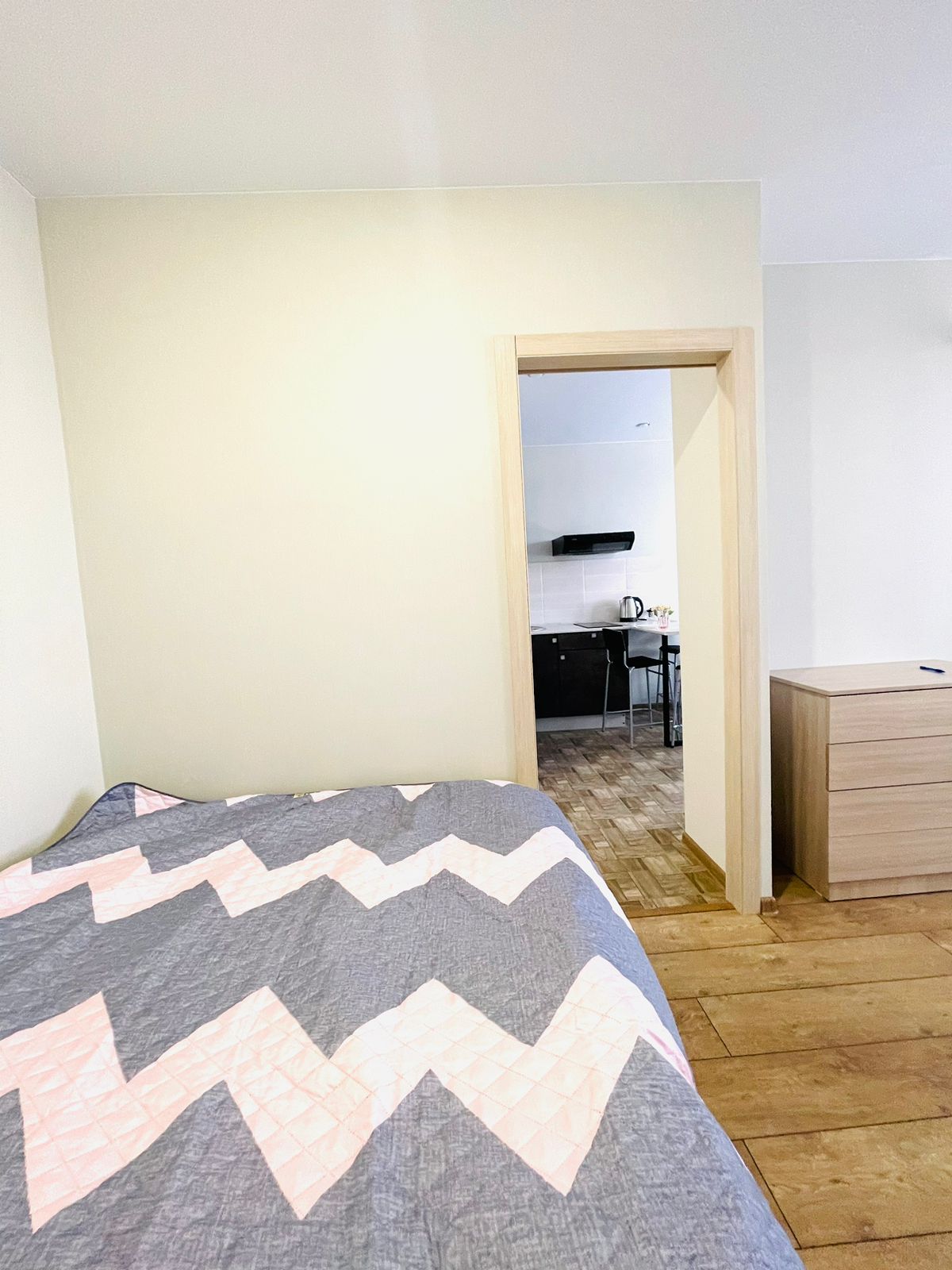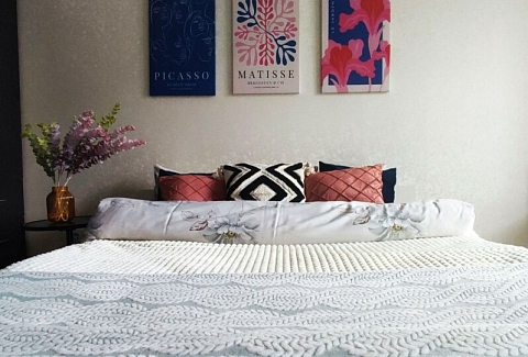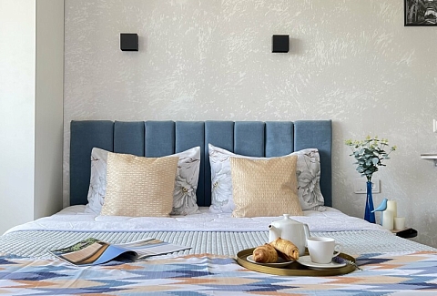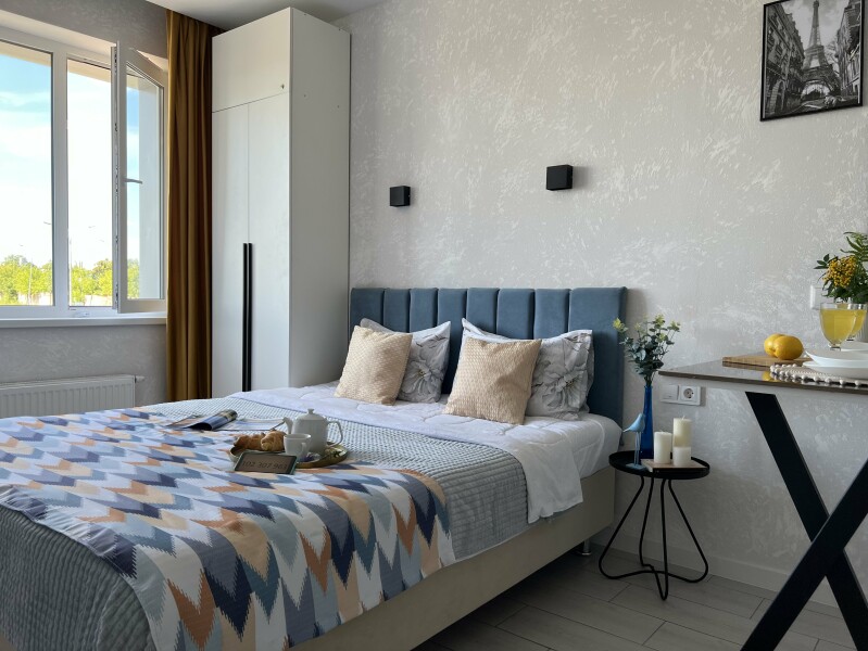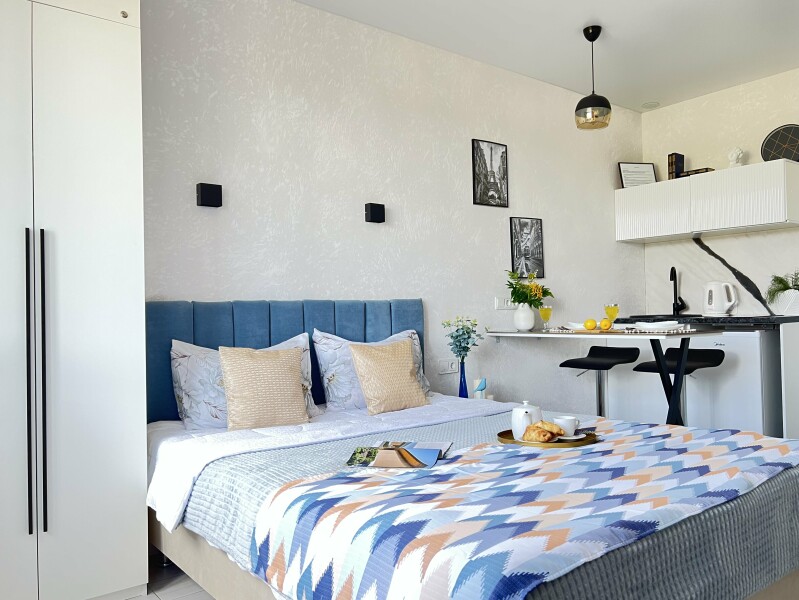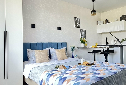 В номере: кровать двуспальная, стол, стулья, шкаф, гладильная доска, кондиционер, микроволновая печь, набор посуды, плита электрическая, стиральная машина, телевизор, утюг, холодильник, чайник