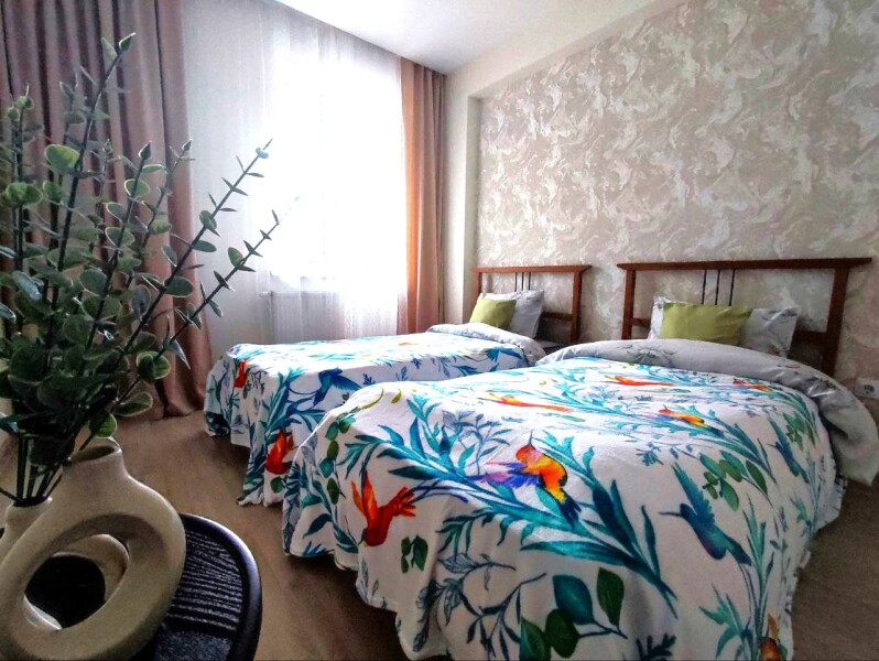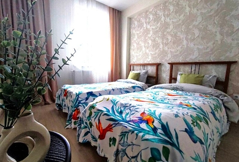 В номере: диван раскладной, кровати односпальные, кровать двуспальная, прикроватные тумбочки, стол, стулья, шкаф, микроволновая печь, набор посуды, плита электрическая, стиральная машина, телевизор, холодильник, чайник