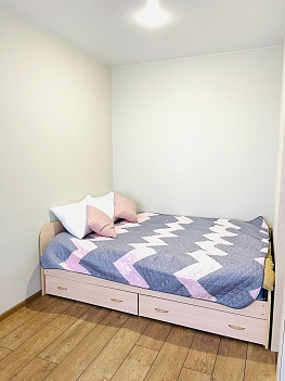 В номере: диван раскладной, кровать двуспальная, прикроватные тумбочки, стол, стулья, шкаф, гладильная доска, набор посуды, плита электрическая, стиральная машина, телевизор, утюг, холодильник, чайник