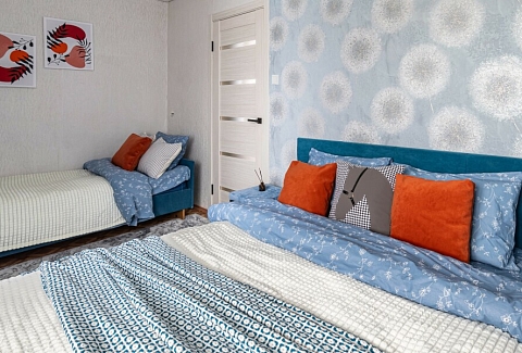 В номере: диван раскладной, кровать двуспальная, кровать односпальная, стол, стулья, шкаф, микроволновая печь, набор посуды, плита электрическая, стиральная машина, телевизор, холодильник, чайник