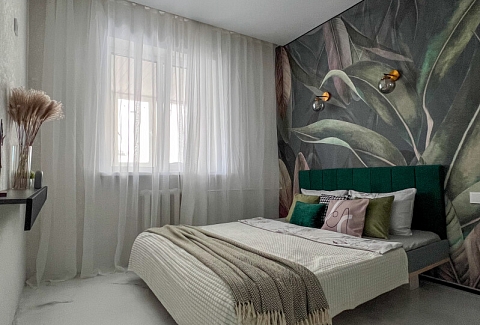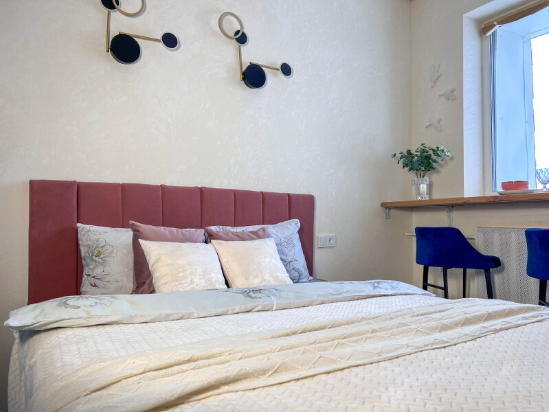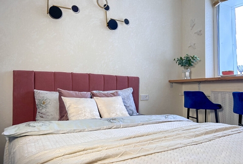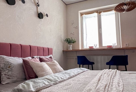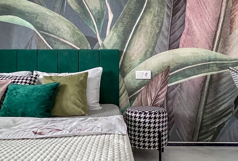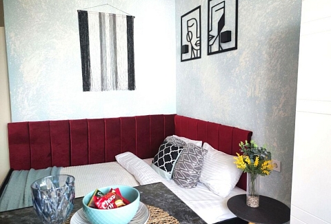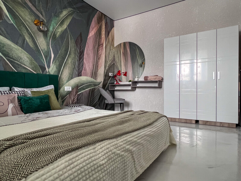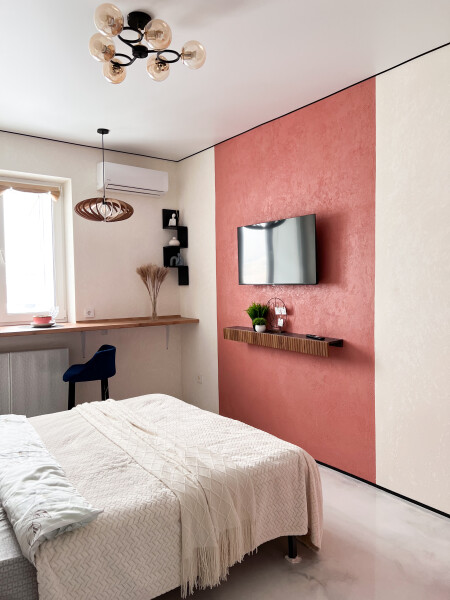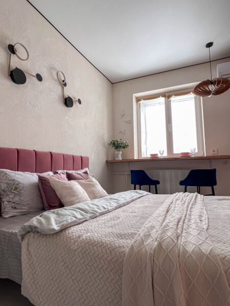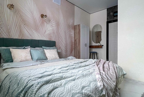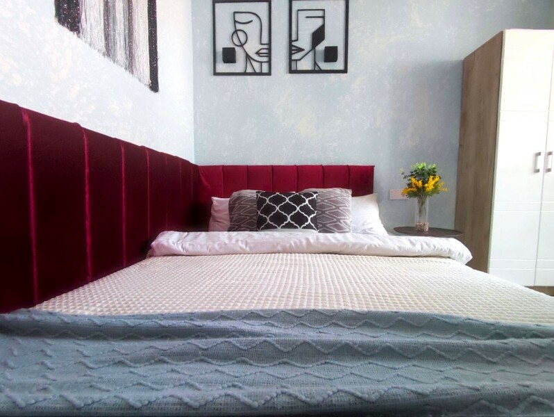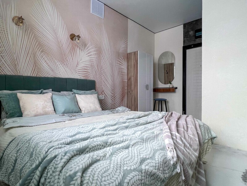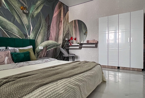 В номере: кровать двуспальная, прикроватные тумбочки, стол, стулья, шкаф, кондиционер, микроволновая печь, набор посуды, плита электрическая, стиральная машина, телевизор, холодильник, чайник