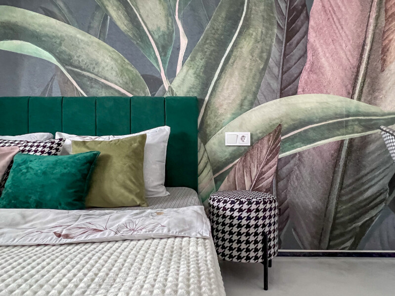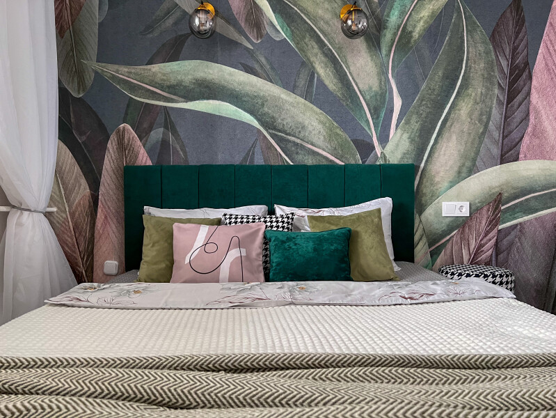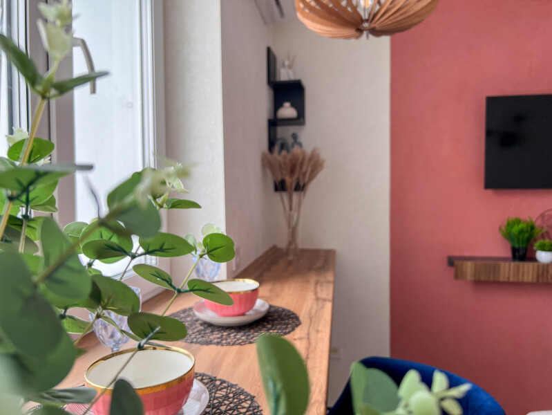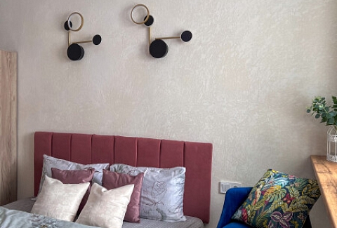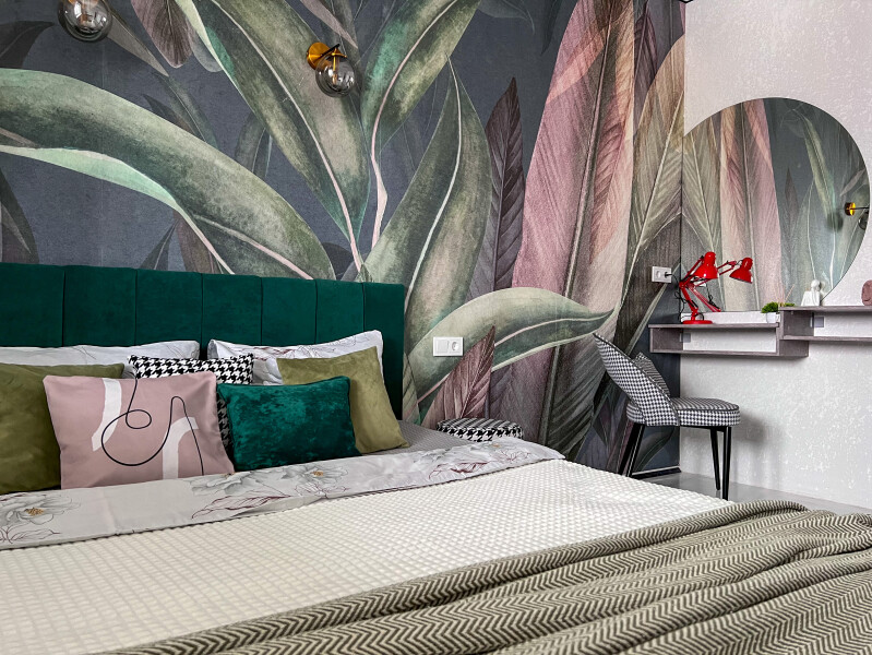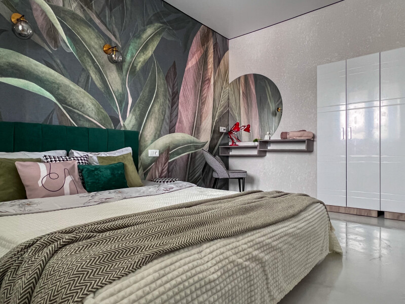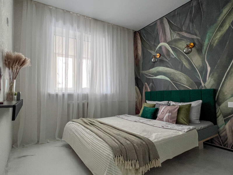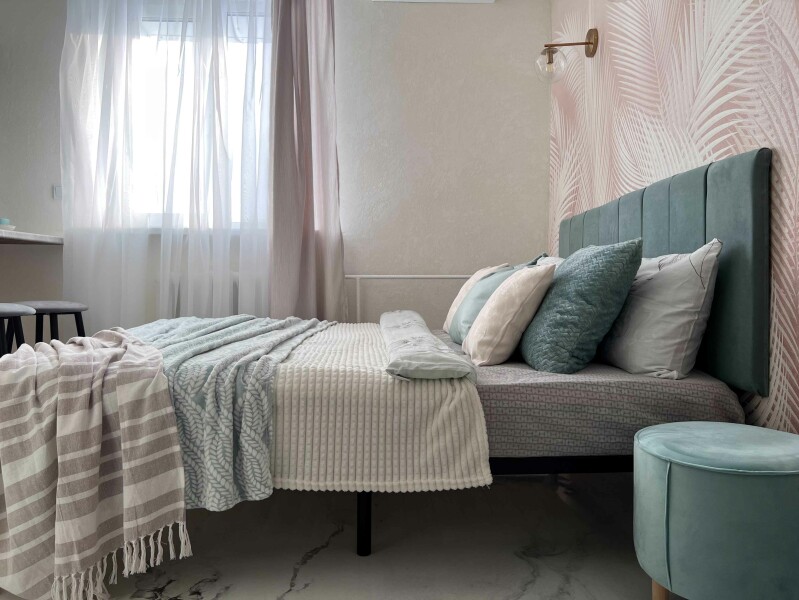 В номере: кровать двуспальная, прикроватные тумбочки, стол, стулья, шкаф, кондиционер, микроволновая печь, набор посуды, плита электрическая, стиральная машина, телевизор, холодильник, чайник