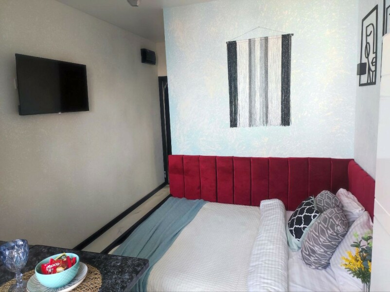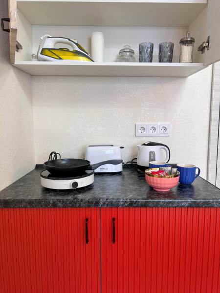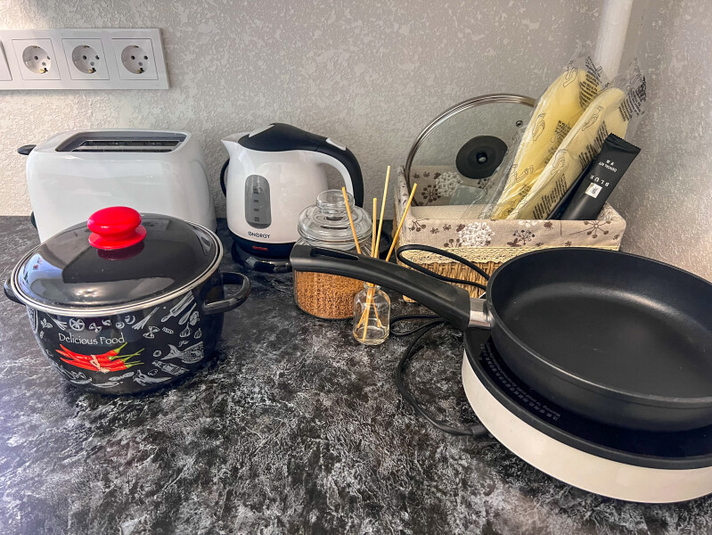 В номере: кровать двуспальная, стол, стулья, шкаф, кондиционер, набор посуды, плита электрическая, стиральная машина, телевизор, холодильник, чайник