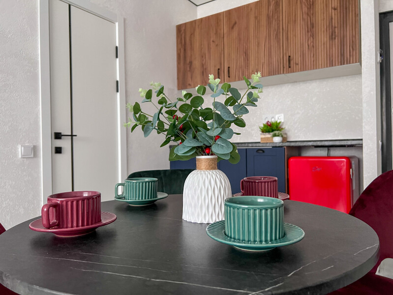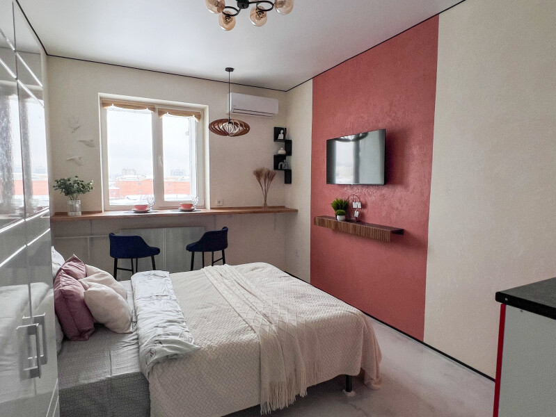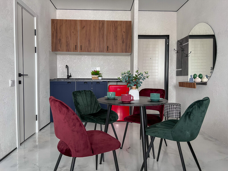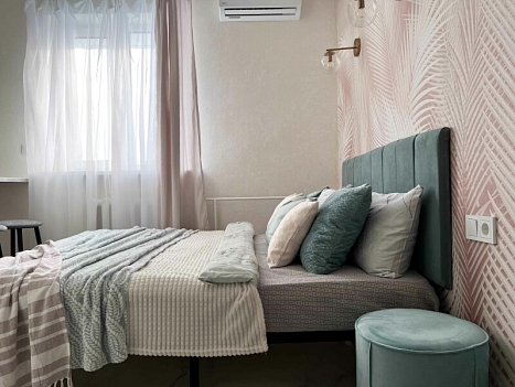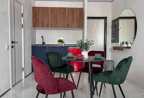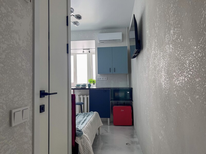В номере: кровать двуспальная, стол, стулья, шкаф, кондиционер, микроволновая печь, набор посуды, плита электрическая, стиральная машина, телевизор, холодильник, чайник