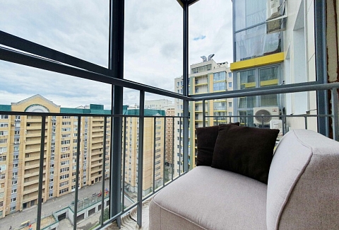 В номере: диван, кровать двуспальная, прикроватные тумбочки, стол, стулья, шкаф, гладильная доска, кондиционер, микроволновая печь, набор посуды, плита индукционная, стиральная машина, телевизор, утюг, холодильник, чайник