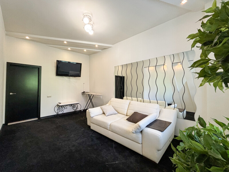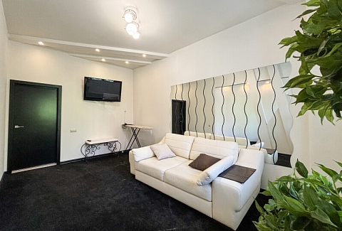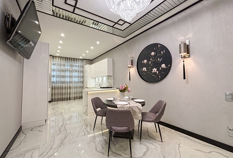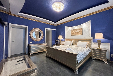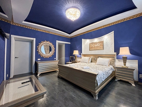 В номере: диван раскладной, кровать двуспальная, прикроватные тумбочки, стол, стулья, шкаф, гладильная доска, кондиционер, микроволновая печь, набор посуды, плита электрическая, стиральная машина, телевизор, утюг, холодильник, чайник