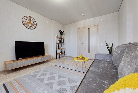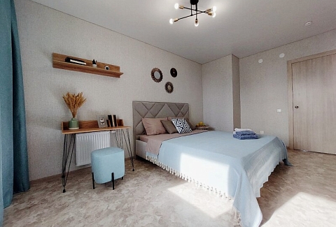 В номере: вешалка, диван раскладной, зеркало, кровать двуспальная, кухонная мебель, прикроватный столик, пуфик, стол, столик кофейный, стол обеденный, стулья, тумба под телевизор, шкаф, гладильная доска, духовой шкаф, микроволновая печь, набор посуды, плита электрическая, стиральная машина, сушилка для белья, телевизор ЖК, утюг, холодильник, чайный набор посуды, электрочайник