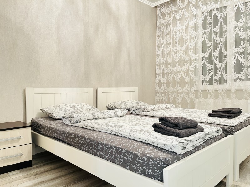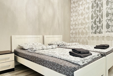 В номере: диван раскладной, кровати односпальные, кровать двуспальная, прикроватные тумбочки, стол, стулья, шкаф, гладильная доска, духовой шкаф, плита индукционная, стиральная машина, телевизор, телефон, утюг, холодильник, чайник