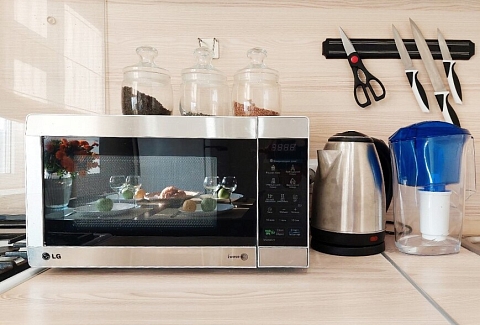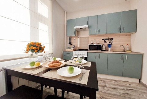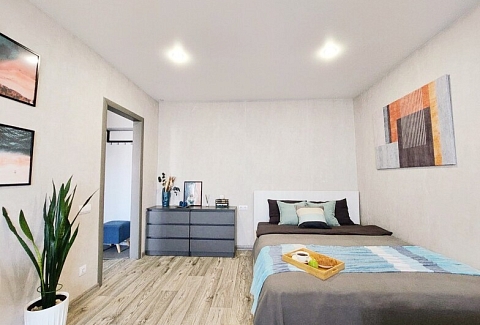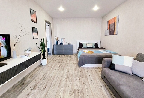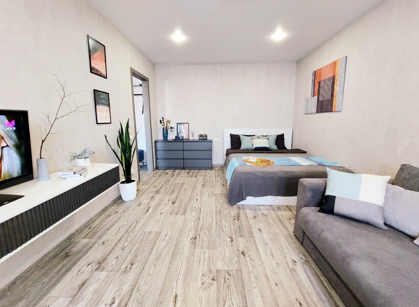 В номере: вешалка, диван, кровать двуспальная, прикроватные тумбочки, стол, стулья, шкаф, гладильная доска, кондиционер, микроволновая печь, набор посуды, плита газовая, стиральная машина, телевизор, холодильник, чайник