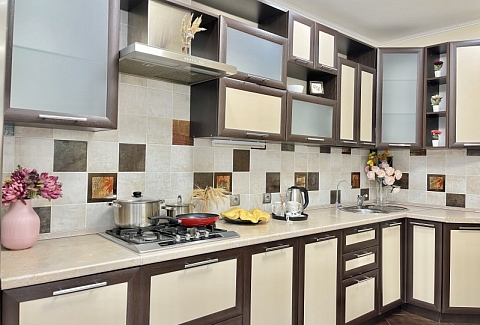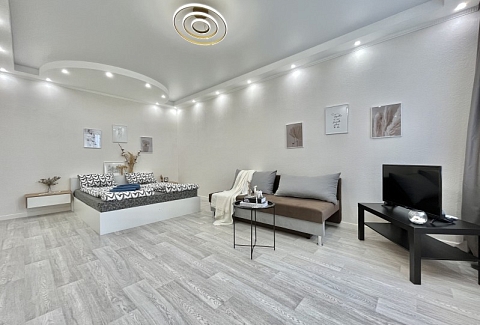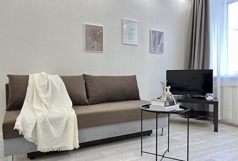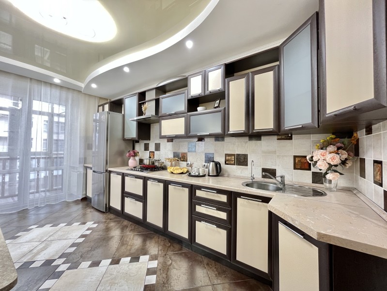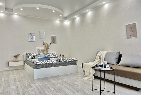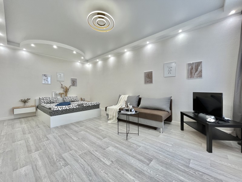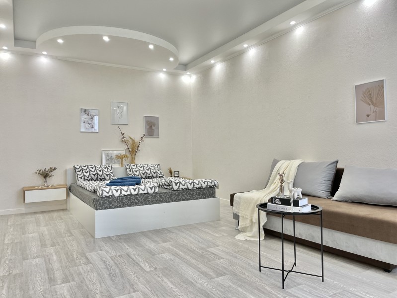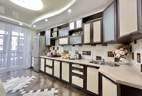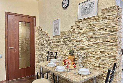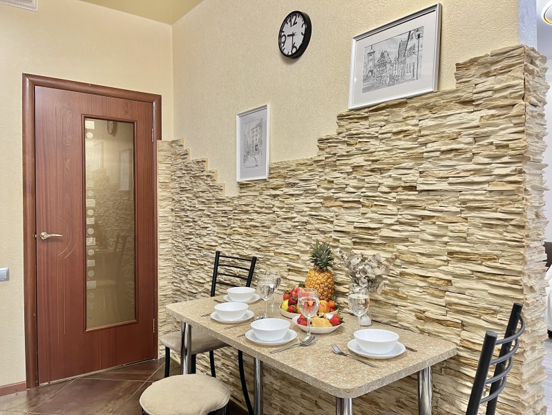 Во дворе имеются детское игровое оборудование и парковка. Поблизости работают церковь, аптека, банковские отделения, многочисленные кафе.Жилая комната предусмотрена для размещения 4 гостей: установлены двуспальная кровать и раскладной диван. Кухня располагает пространством для приготовления еды, обеденной зоной, панорамным остеклением. Прихожая оснащена вместительным шкафом-купе с большими зеркалами. Совмещенный санузел укомплектован ванной, биде, стиральной машиной. Для постояльцев предусмотрено подключение к Wi-Fi.