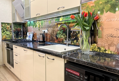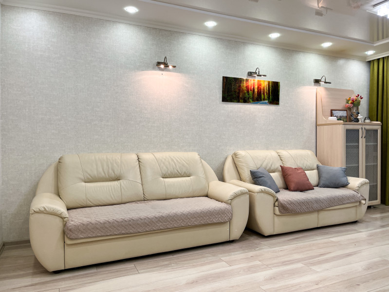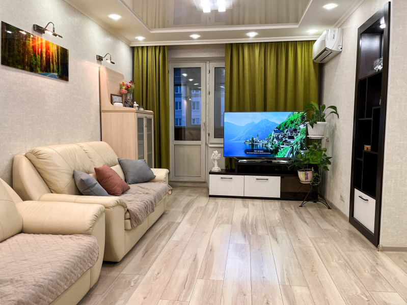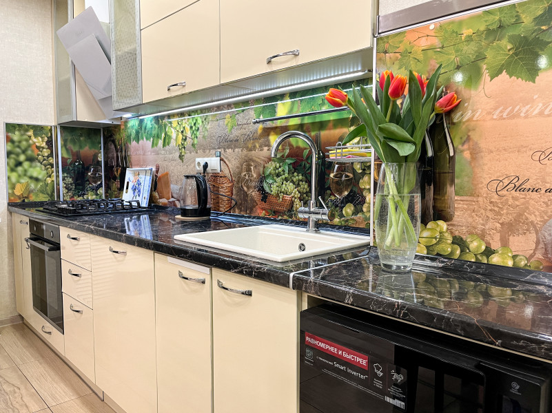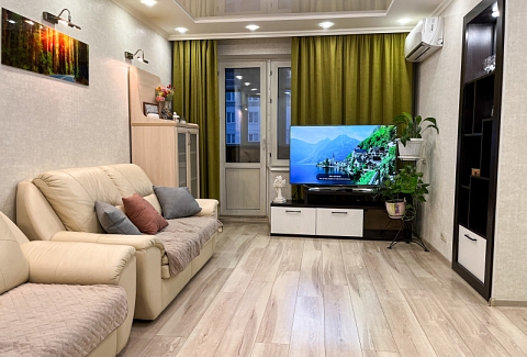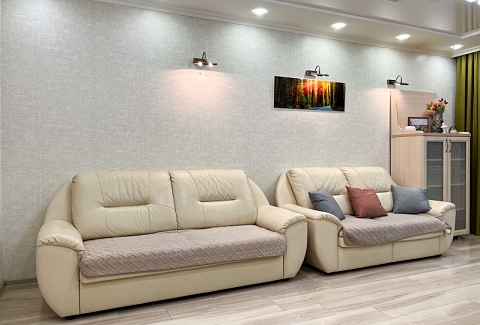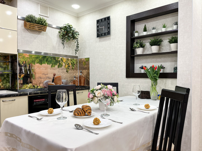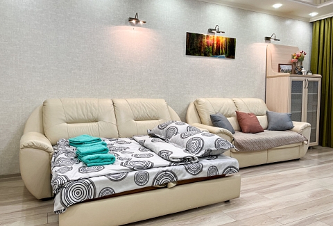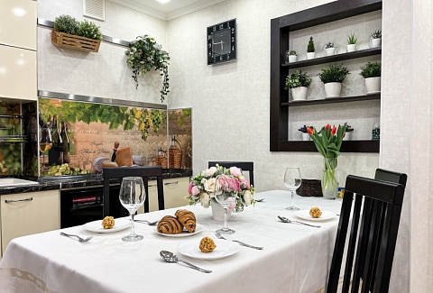 В номере: диван раскладной, кровать двуспальная, прикроватные тумбочки, стол, стулья, шкаф, гладильная доска, кондиционер, набор посуды, плита электрическая, посудомоечная машина, стиральная машина, телевизор, утюг
