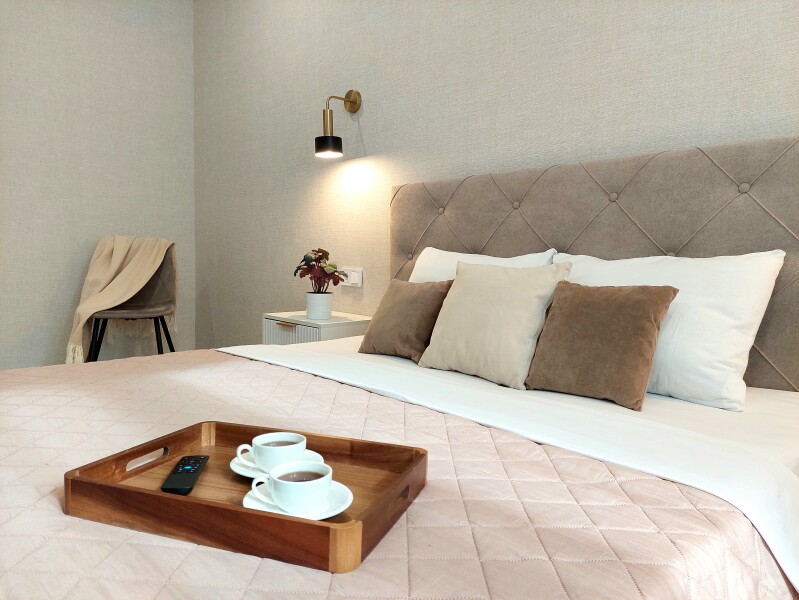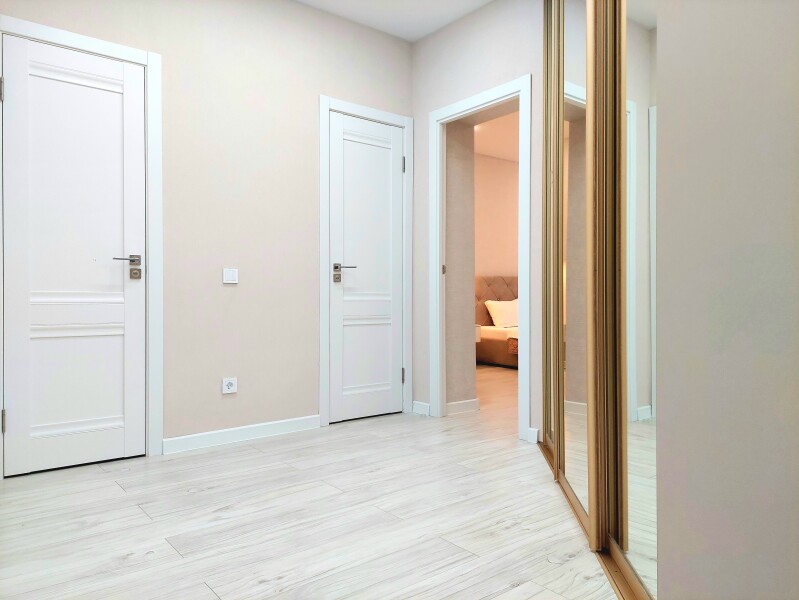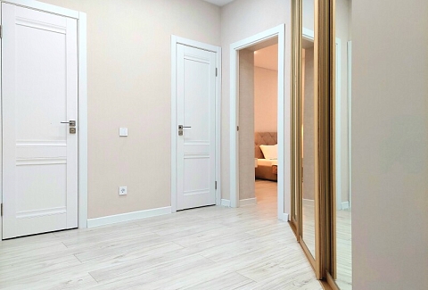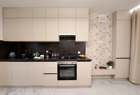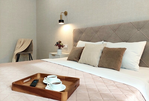 В номере: вешалка, диван раскладной, зеркало, кровать двуспальная, кухонная мебель, прикроватные столики, стол обеденный, стулья, шкаф, гладильная доска, духовой шкаф, кондиционер, микроволновая печь, набор посуды, плита газовая, стиральная машина, сушилка для белья, телевизор ЖК, утюг, холодильник, чайный набор посуды, электрочайник