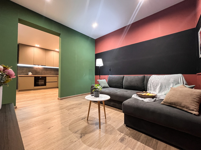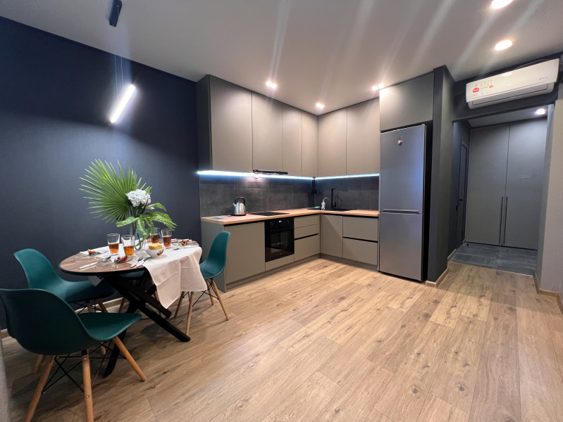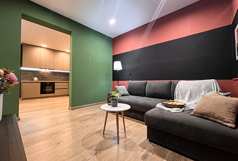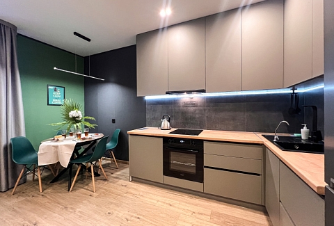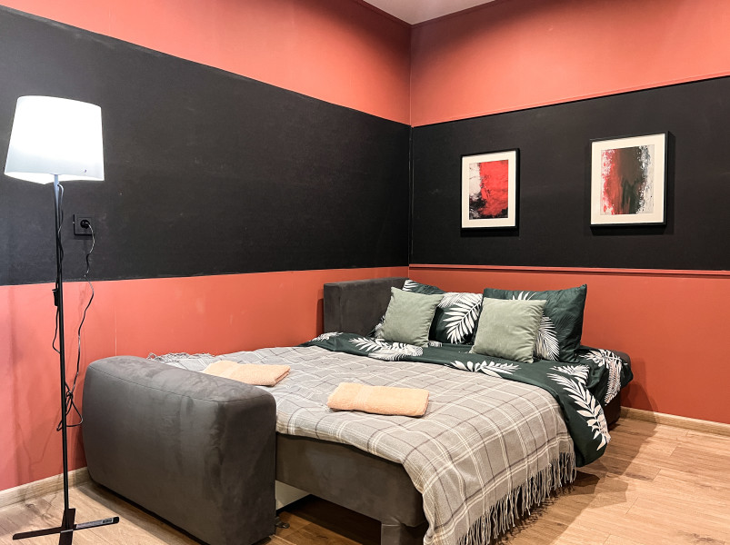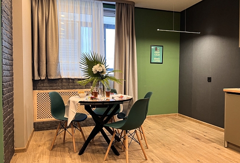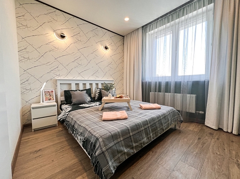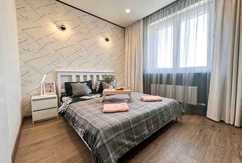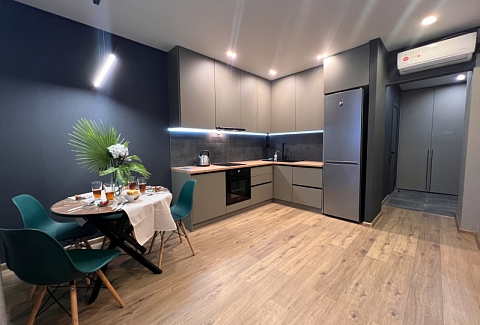 В номере: вешалка, диван раскладной, кровать двуспальная, прикроватные тумбочки, стол, стулья, шкаф, гладильная доска, кондиционер, набор посуды, плита индукционная, стиральная машина, телевизор, утюг, холодильник