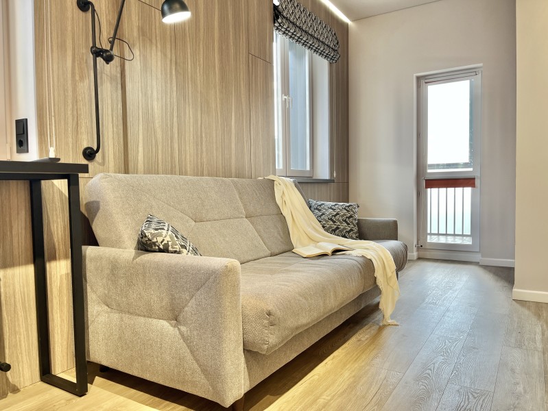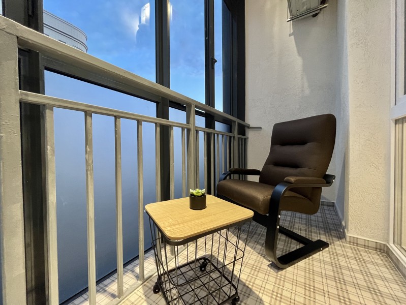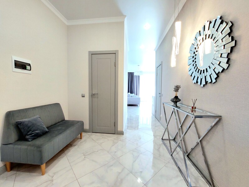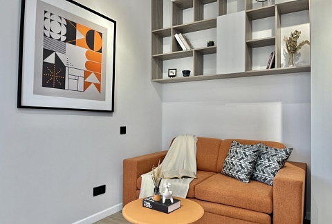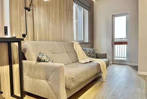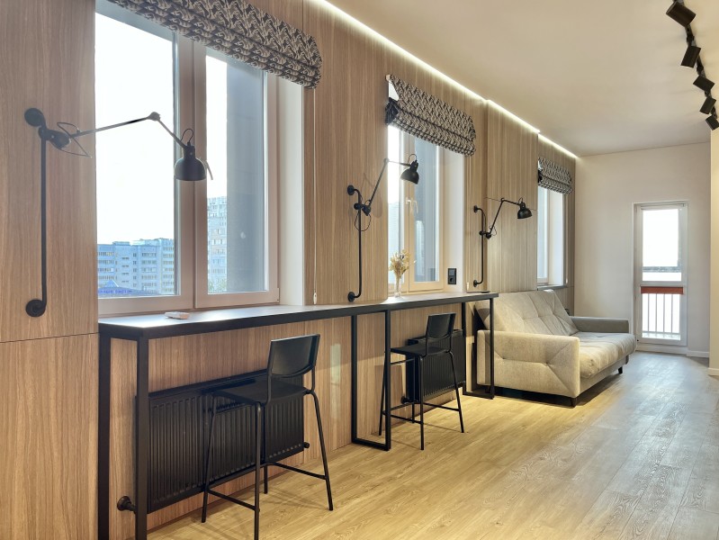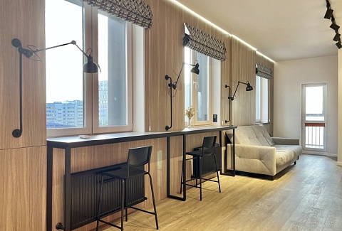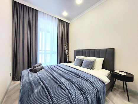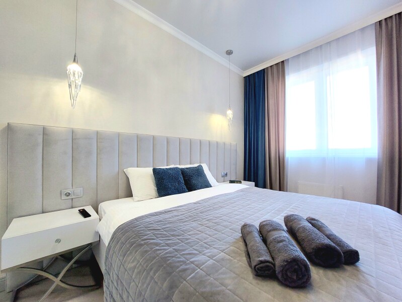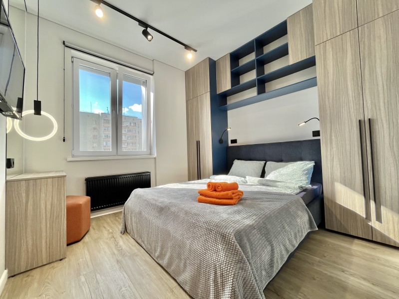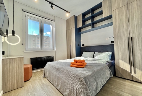 На первом этаже открыты аптека и магазин парфюмерии, ближайший продуктовый магазин работает в соседнем здании.Апартаменты оформлены в теплых оттенках и дополнены яркими цветовыми деталями. Много окон добавляют помещениям света. Оснащена уютная изолированная спальня с двуспальной кроватью и местами для хранения вещей. В кухне-гостиной обустроены пространство для приготовления еды с посудомоечной машиной и обеденная зона, установлены раскладной диван и барная стойка вдоль окон. Совмещенный санузел располагает ванной и стиральной машиной. В прихожей имеются небольшой диван и вместительные шкафы. На панорамном балконе — уютная лаундж-зона. Для гостей доступно подключение к Wi-Fi.