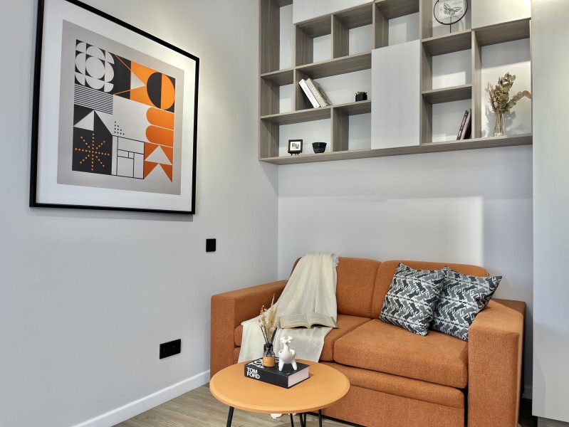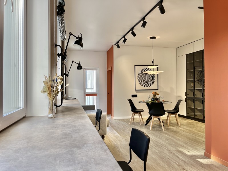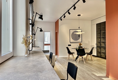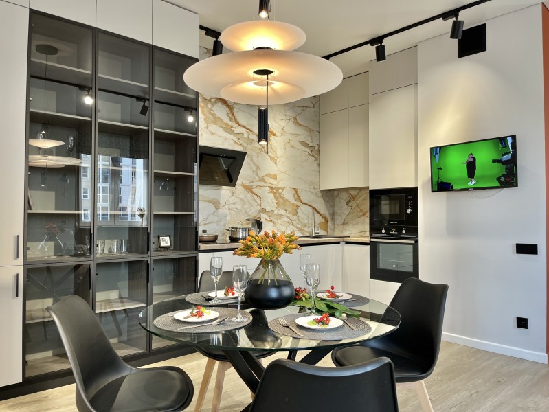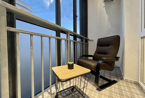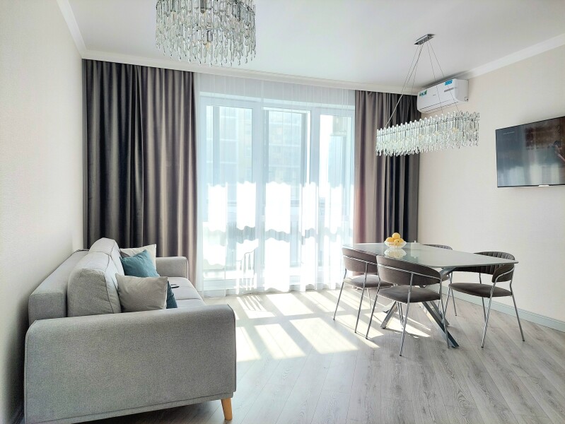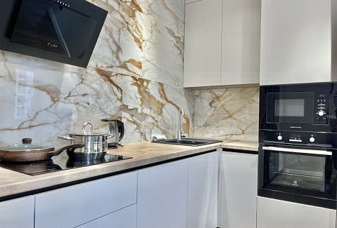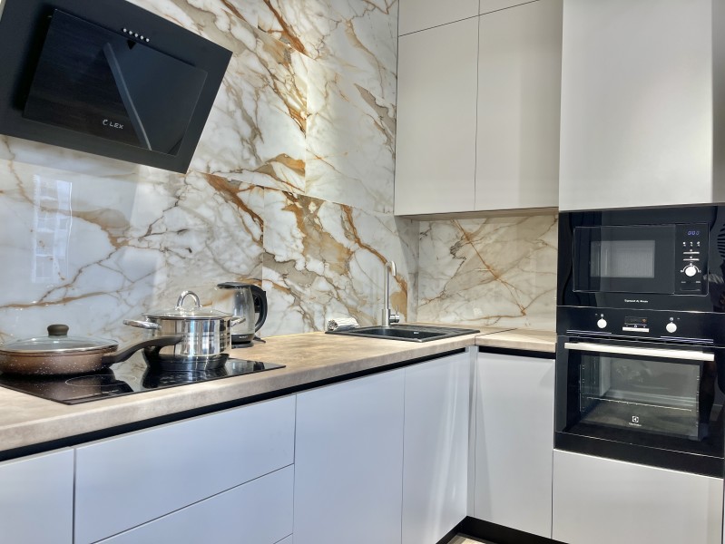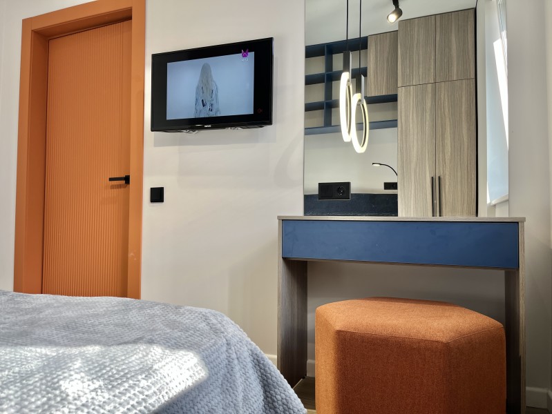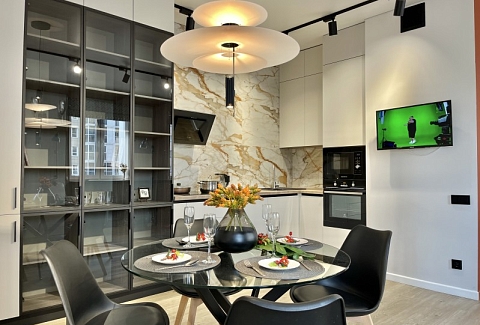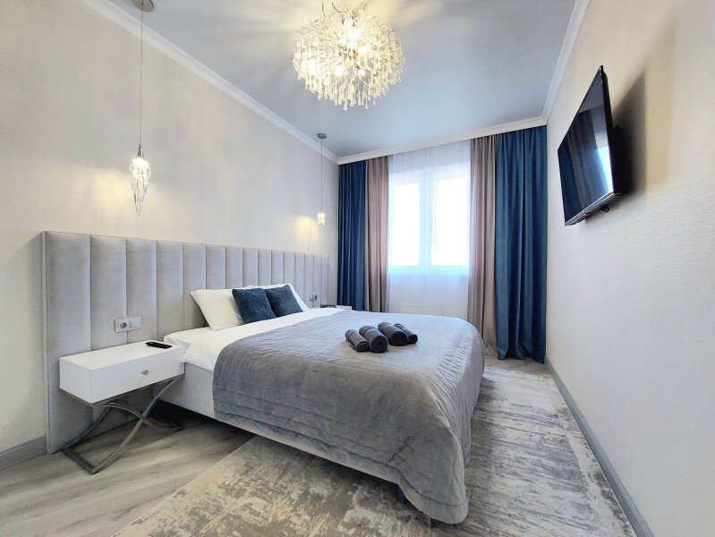 На первом этаже открыты аптека и магазин парфюмерии, ближайший продуктовый магазин работает в соседнем здании.Апартаменты оформлены в теплых оттенках и дополнены яркими цветовыми деталями. Много окон добавляют помещениям света. Оснащена уютная изолированная спальня с двуспальной кроватью и местами для хранения вещей. В кухне-гостиной обустроены пространство для приготовления еды с посудомоечной машиной и обеденная зона, установлены раскладной диван и барная стойка вдоль окон. Совмещенный санузел располагает ванной и стиральной машиной. В прихожей имеются небольшой диван и вместительные шкафы. На панорамном балконе — уютная лаундж-зона. Для гостей доступно подключение к Wi-Fi.